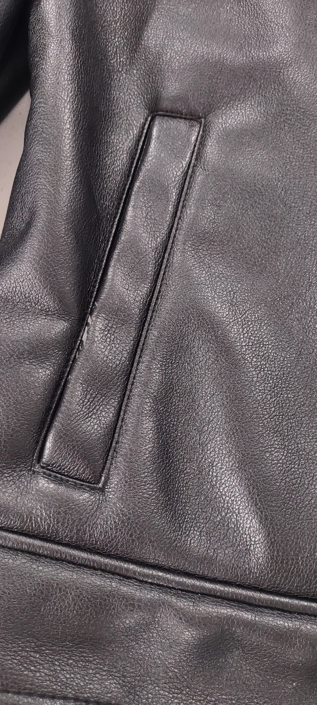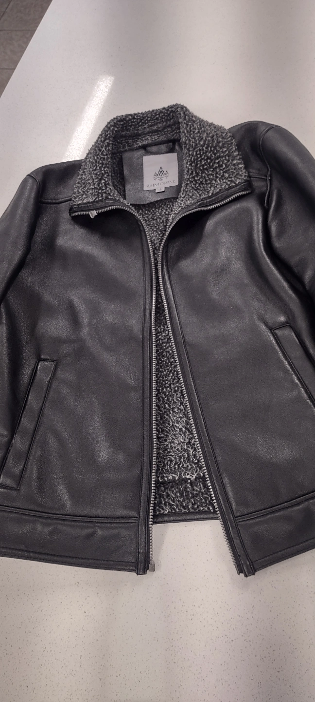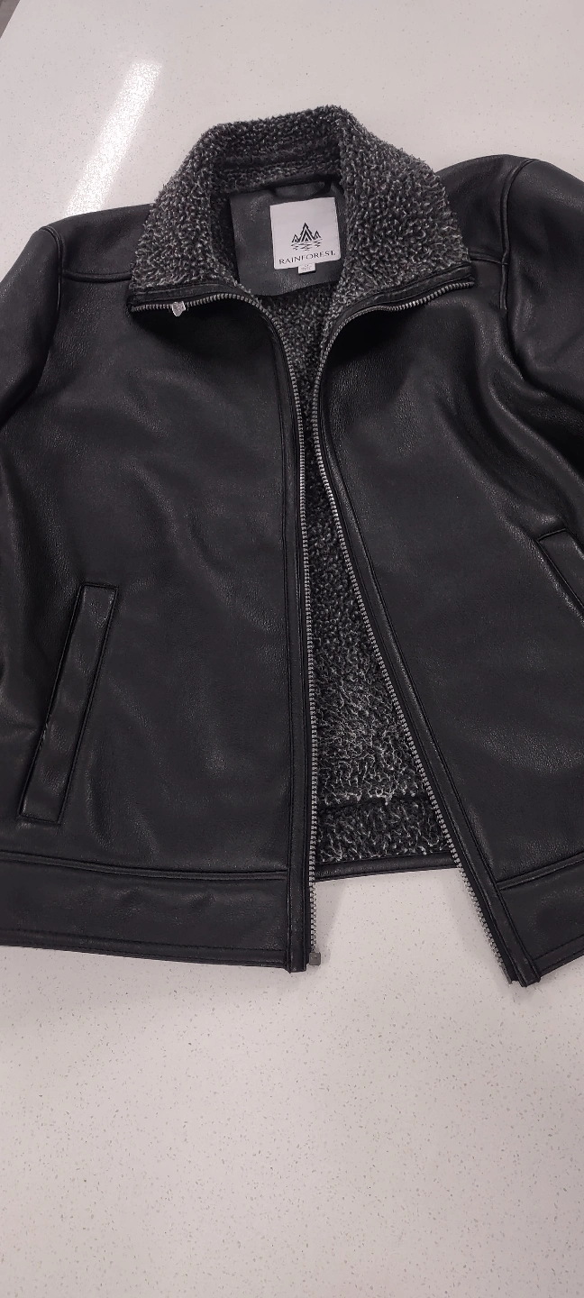 1000+Men's black faux leather jacket. Features a sherpa fleece lining, zipper closure, and two front pockets. minor wear.