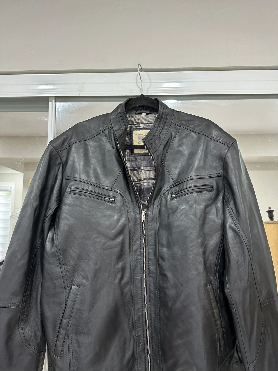 119Men's black leather jacket. Full zip closure. Features a plaid flannel liner. Multiple pockets. Classic style. Genuine leather