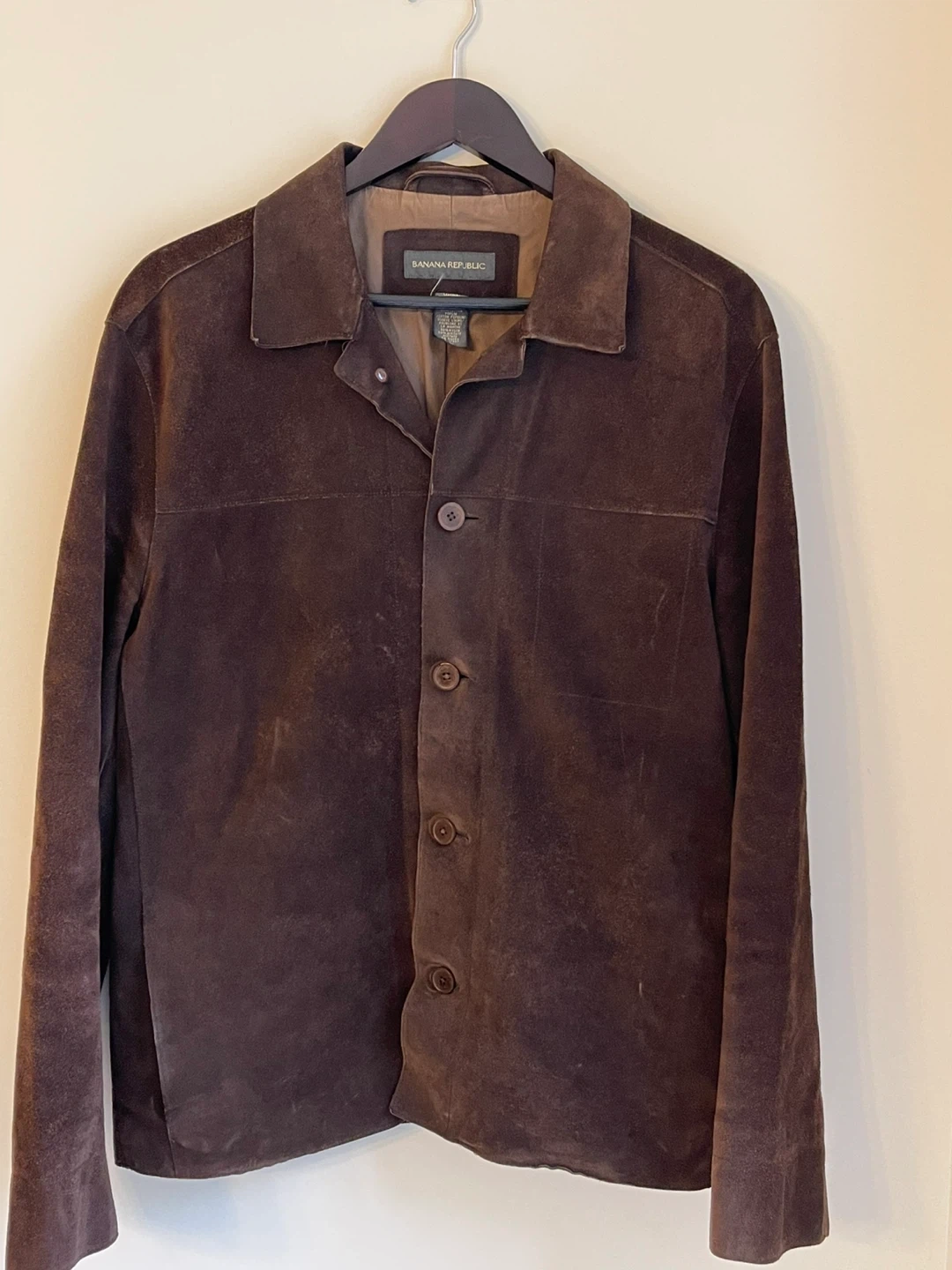 28Men’s Brown “Vintage” Banana Republic Suede Button Up Jacket from the 90’s Well loved charm $45 cash only please Specifications: * Brand: Banana Republic * Material: Suede Leather * Size: Large * Colour: Brown * Style: Button-Up Smoke free pet free home Meet at Tim Horton’s/Shell Station 780 South Sheridan Way Mississauga L5H1Z6 If the ad is up, it's still available, so don't miss out! Please see what else I have for sale. Thank you!