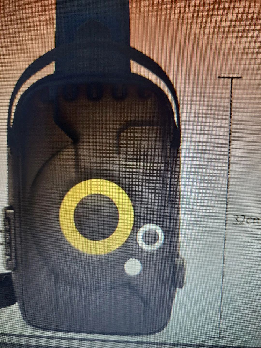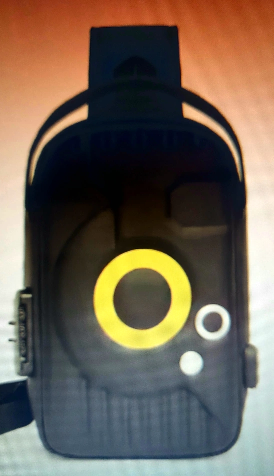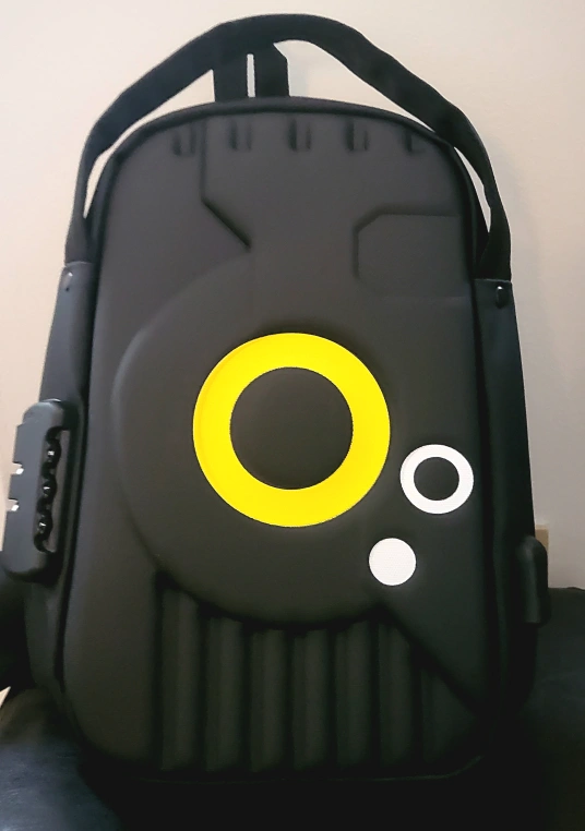 15This is a black shoulder carry bag. It has a unique design with a yellow circle and white dots on the front. It also features a USB connection and a shoulder strap for easy carrying