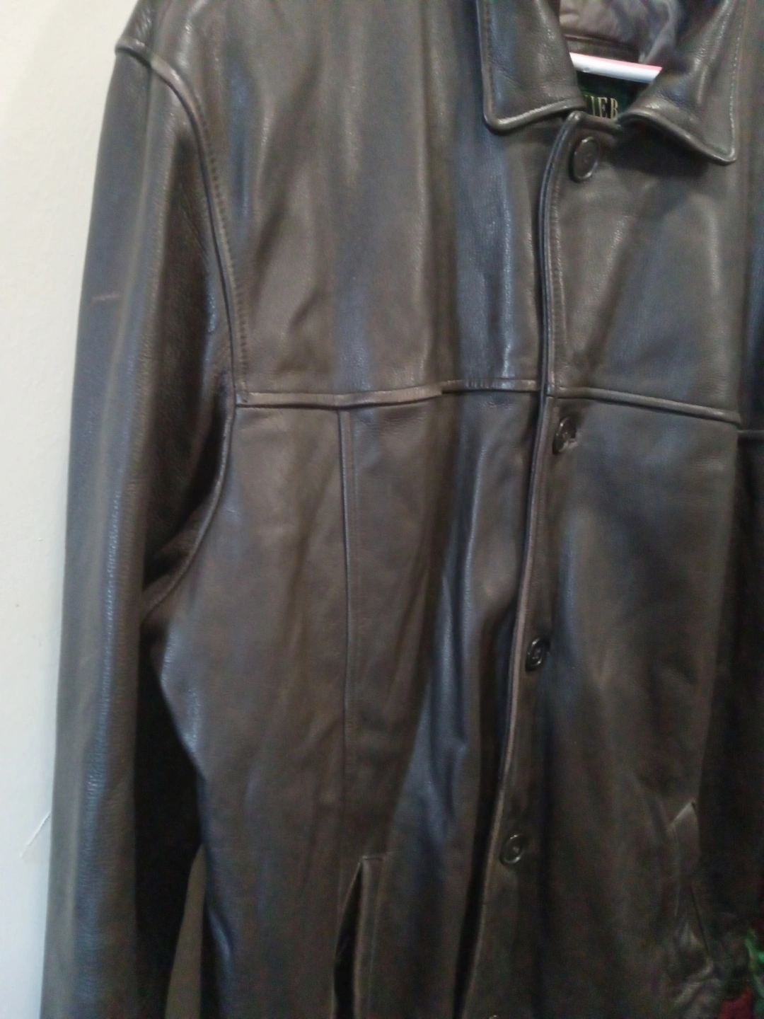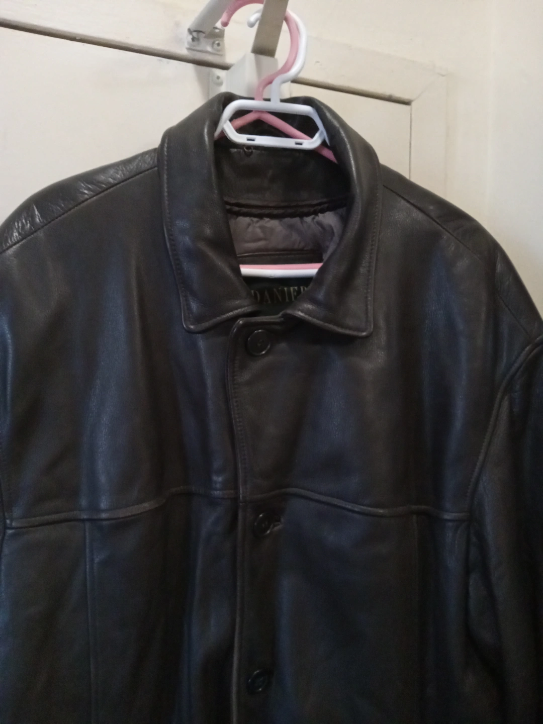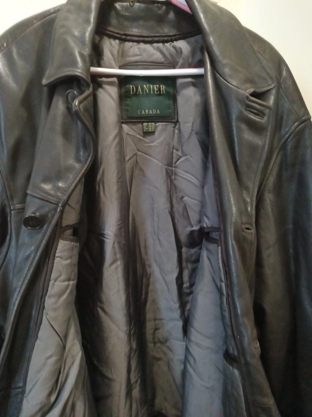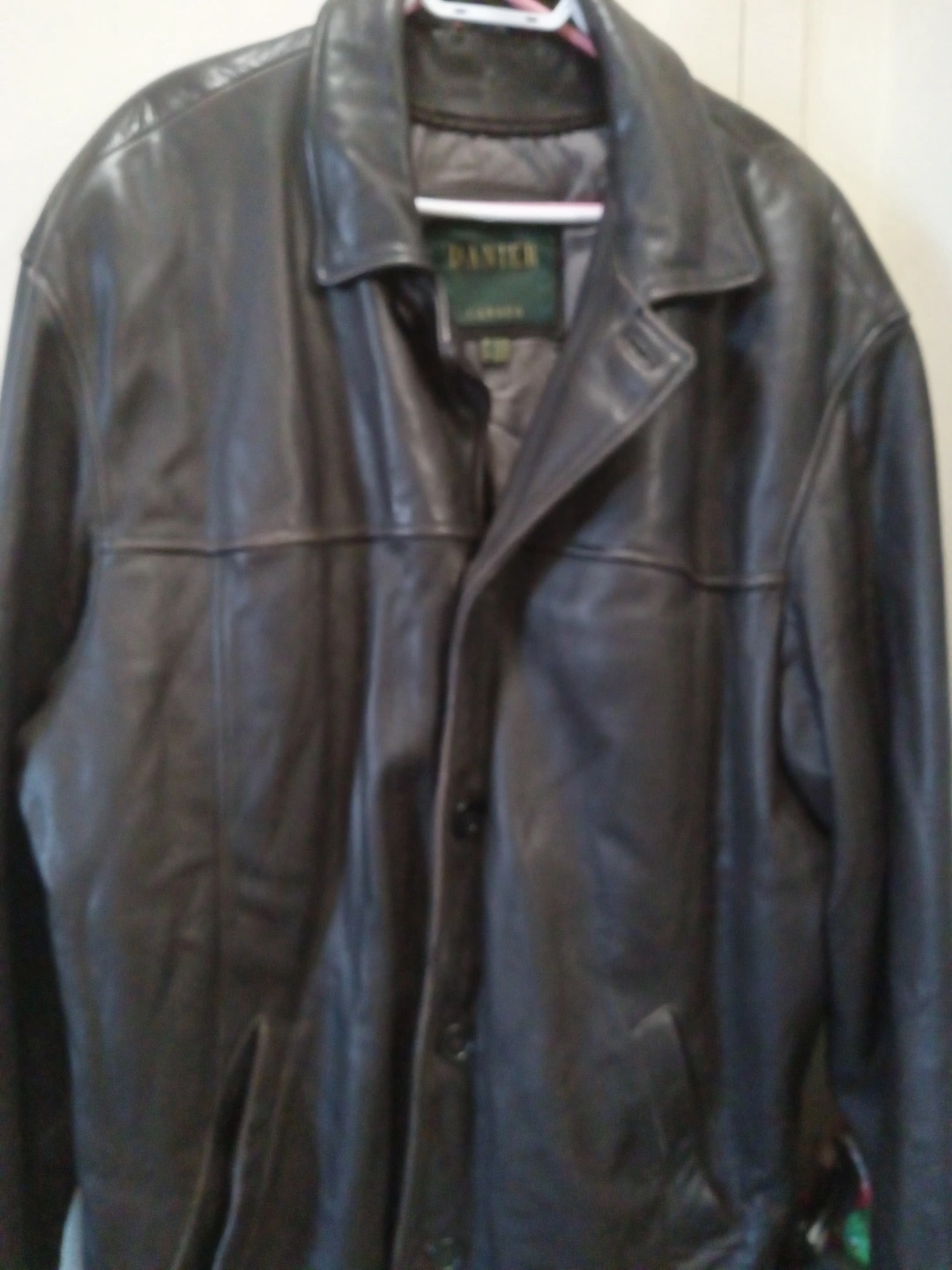 417Dark brown leather jacket. Features button closures and pockets. Good condition. Size large.