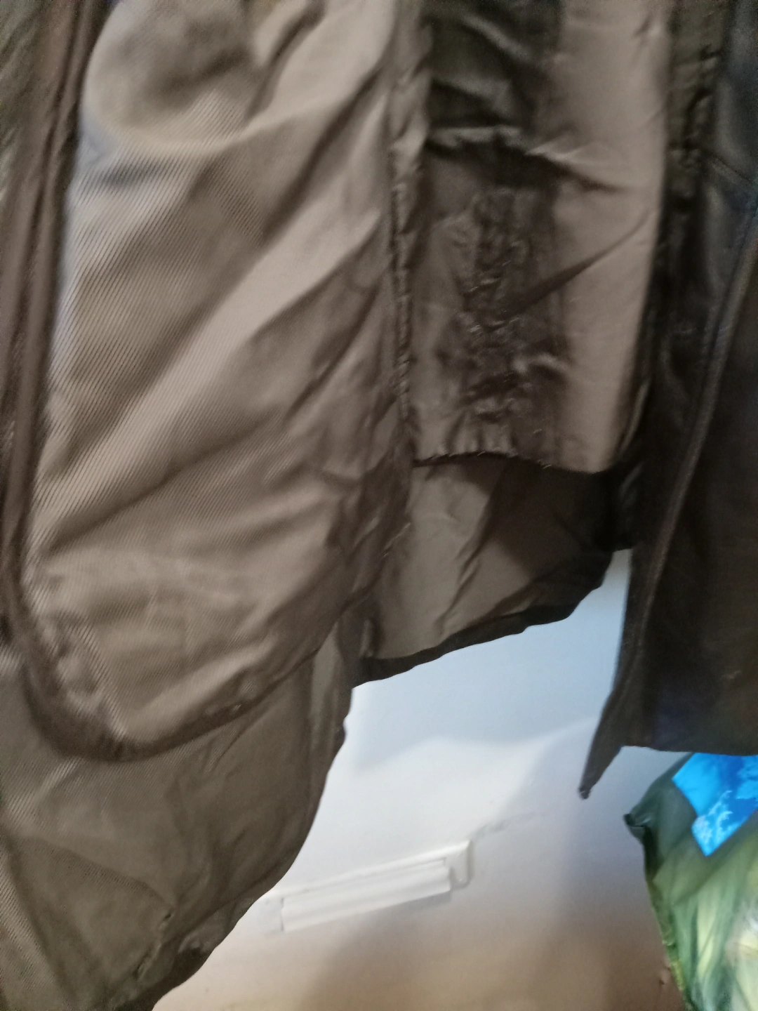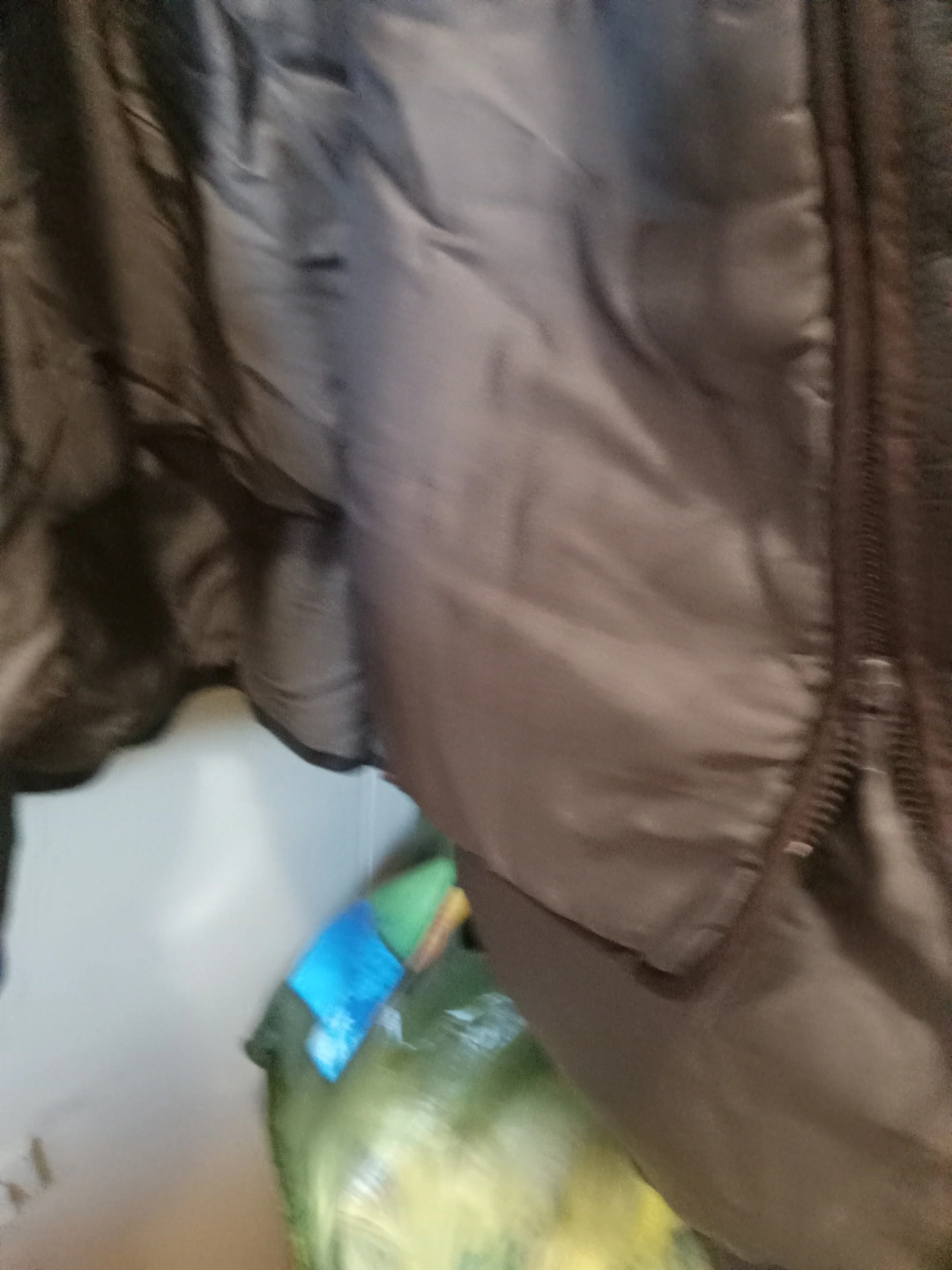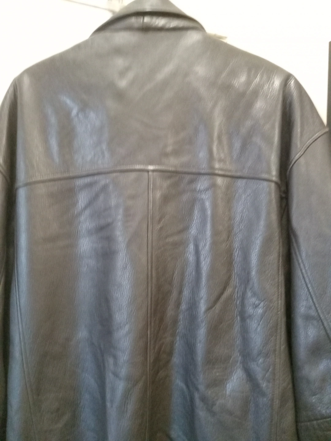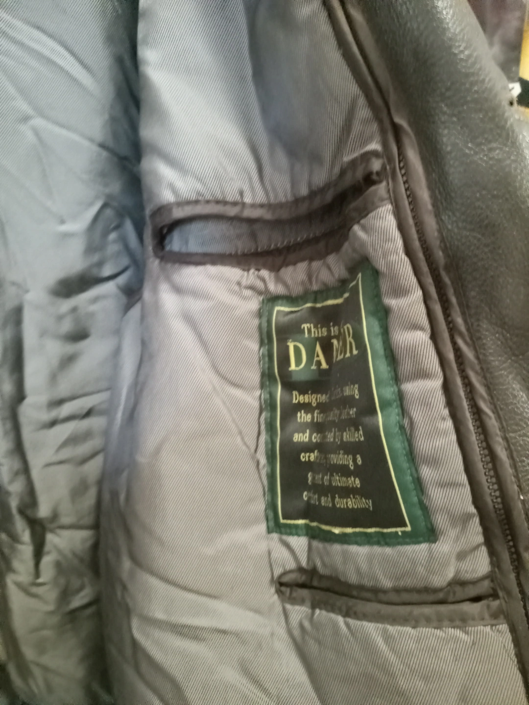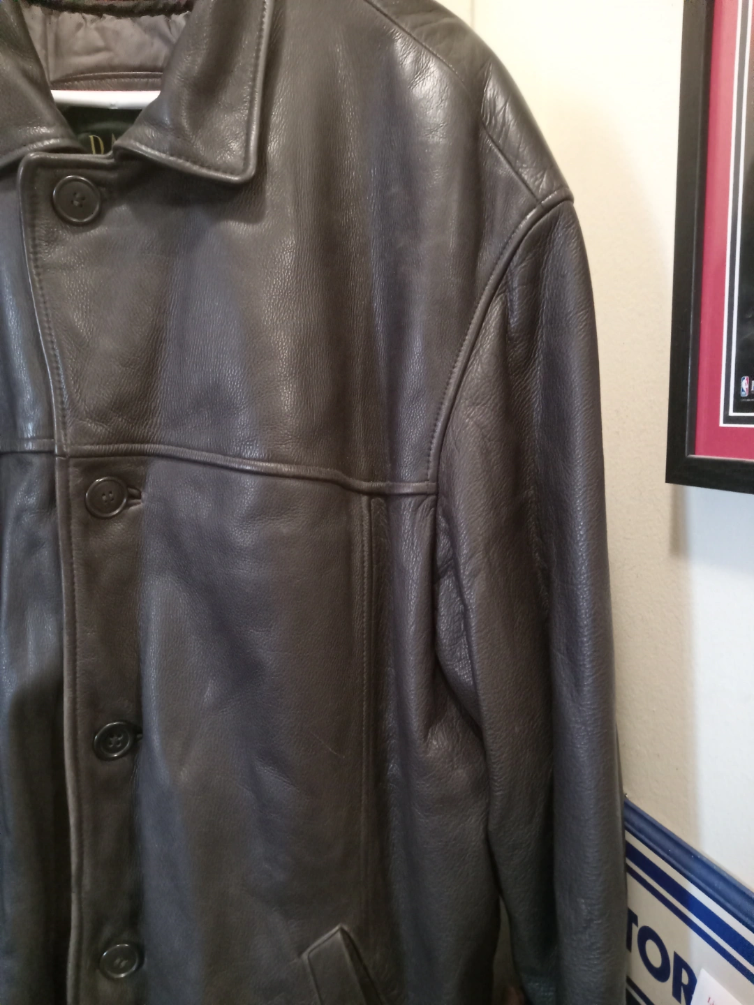 417Dark brown leather jacket. Features button closures and pockets. Good condition. Size large.