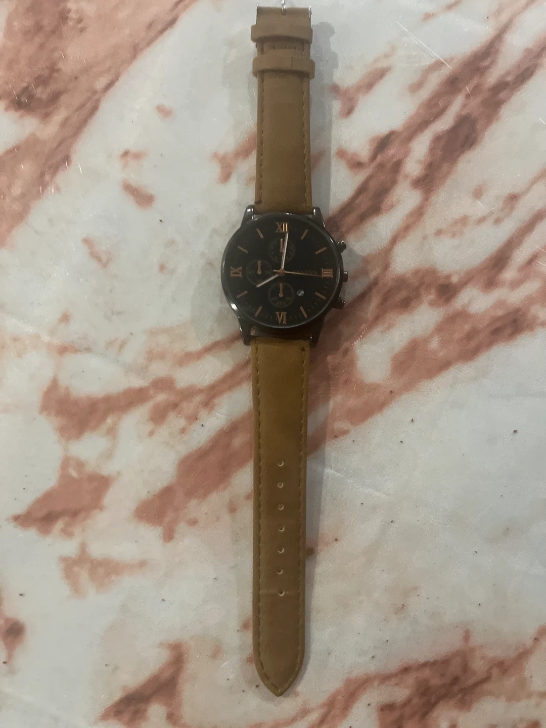 173Selling a stylish men's fashion watch. It features a classic black face with tan leather strap. A great accessory for any outfit!