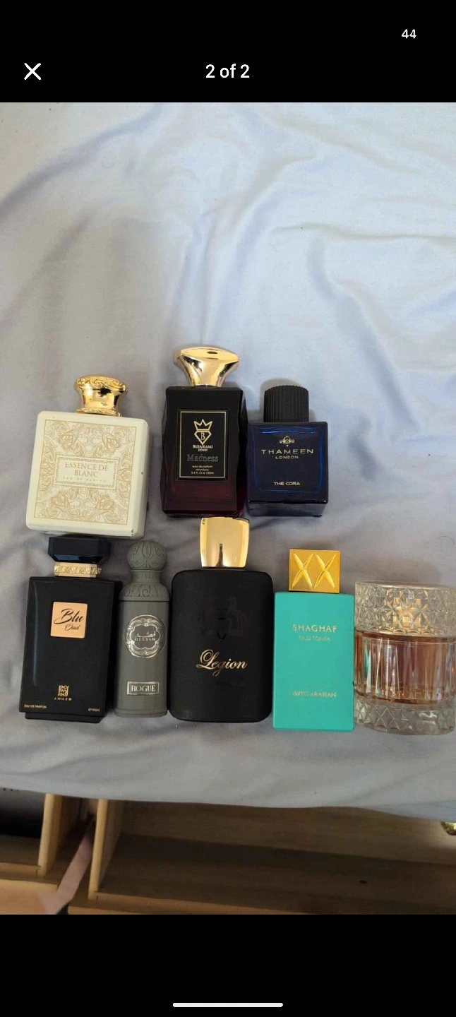 Selling a collection of assorted perfume bottles. Includes: - Essence de Blanc - Madness - Thameen London The Cora - Blu Oud - Rogue - Legion - Shaghaf Oud Tonka and more! They are in great condition