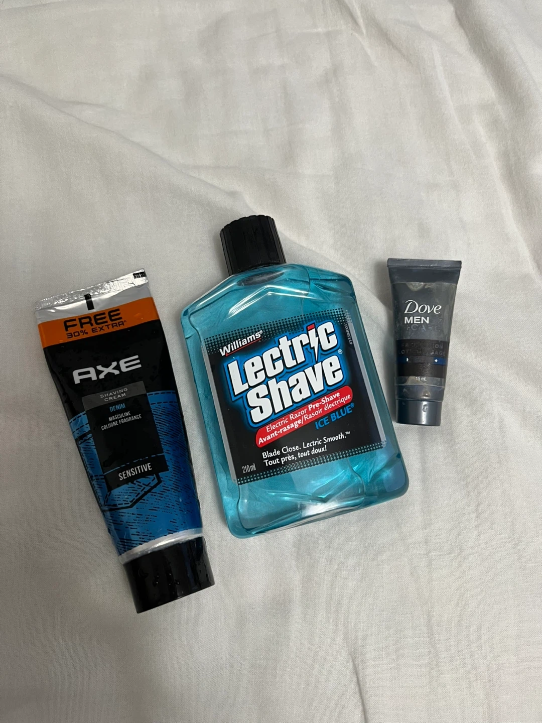 307Selling a lot of men's grooming products! Includes: - Axe Shaving Cream (Denim, Masculine Cologne Fragrance, Sensitive) - Williams Lectric Shave (Ice Blue, 210ml) - Dove Men+Care (15ml)