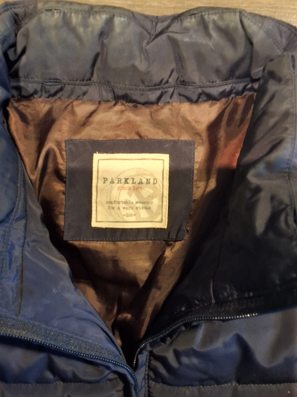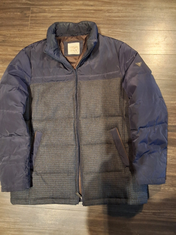 Men's navy and grey patterned puffer jacket. Zipper closure. Good condition. Warm winter wear.