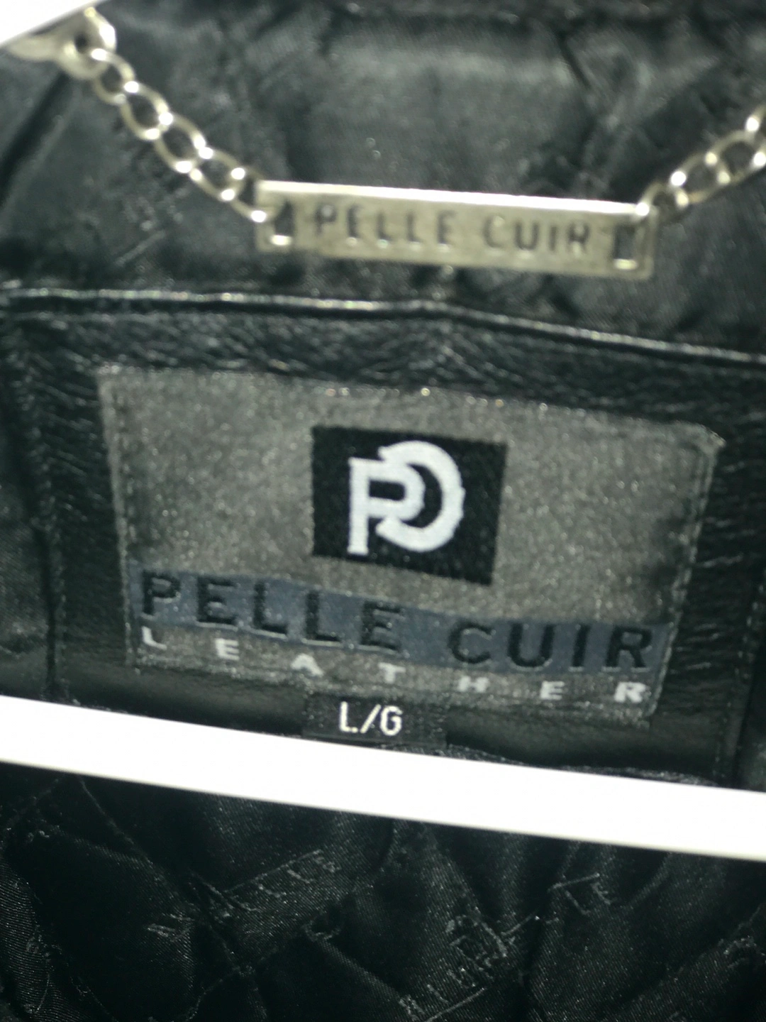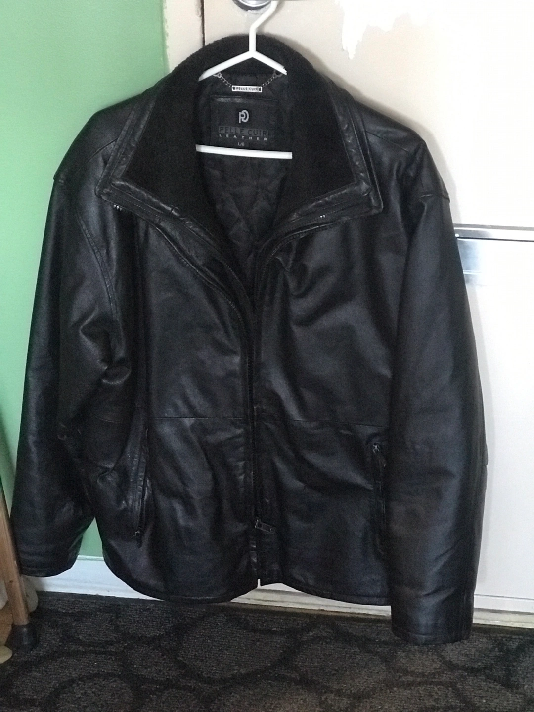 Black leather jacket. Size large/6. Features a quilted lining and zipper closure. Good condition.