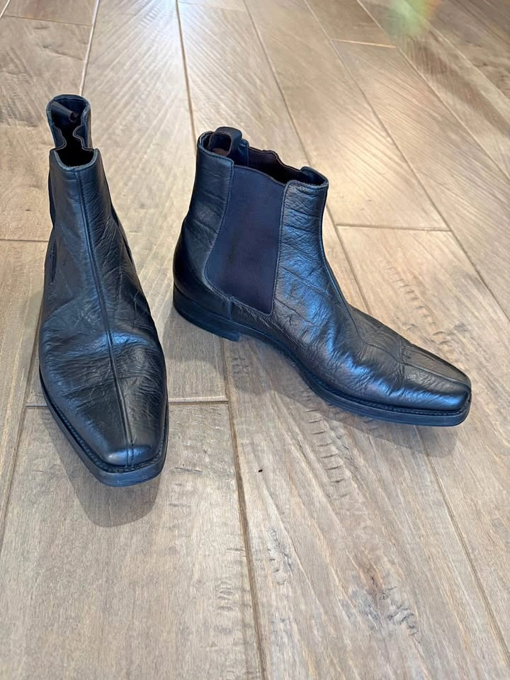 Vintage Prada men’s Chelsea boots. Handcrafted in Italy from premium leather with a traditional leather sole. Timeless design, beautifully made, and built to last. Details: • Brand: Prada • Style: Men’s Chelsea Boots • Origin: Made in Italy • Material: Genuine leather upper and sole • Color: Black • Size: Prada 8.5 (9.5 US) • Condition: Gently worn These are not modern reproductions. True vintage Prada quality with the craftsmanship and feel you only get from earlier Italian-made designs. Pickup in Milton / Toronto