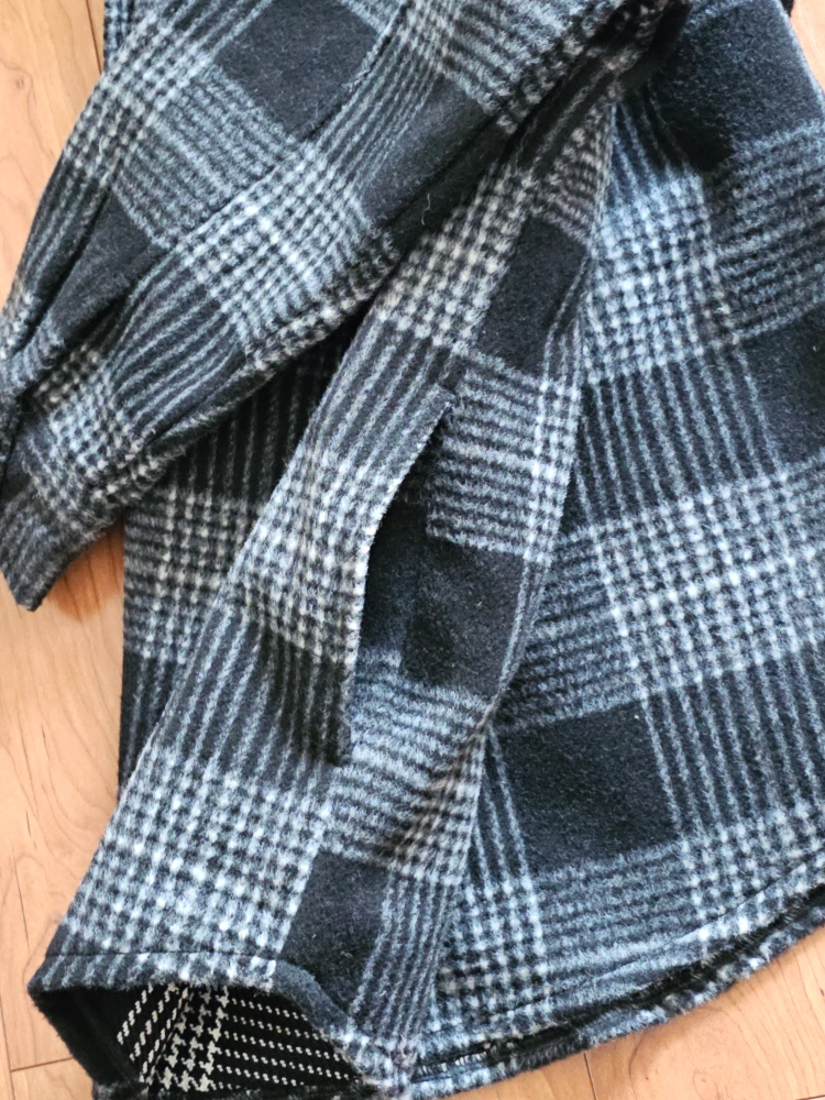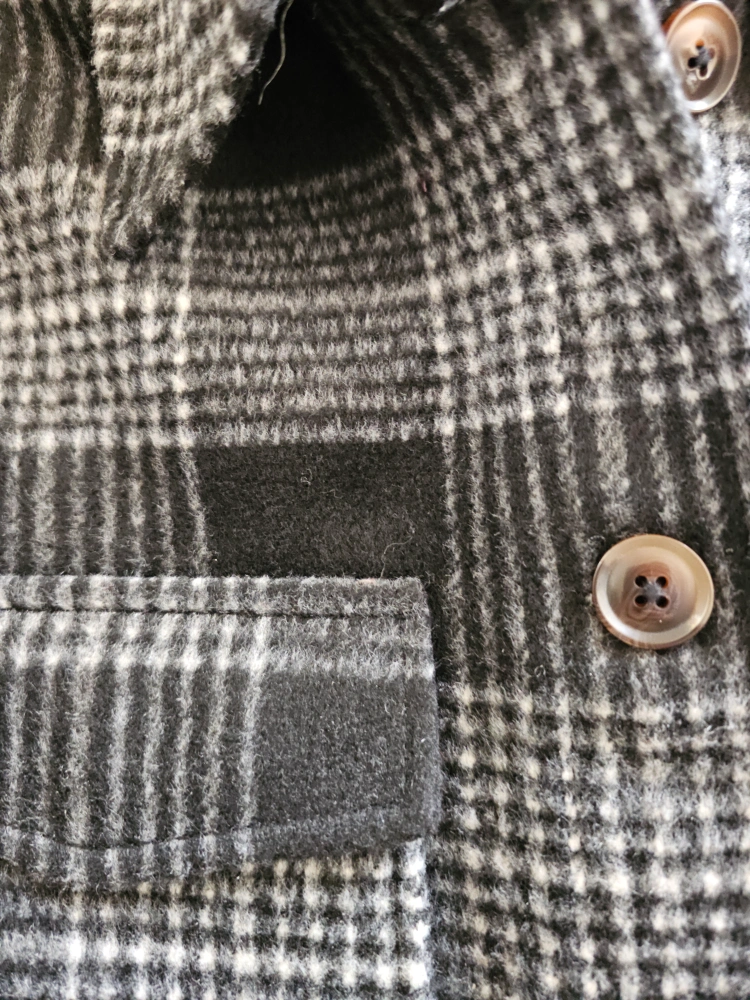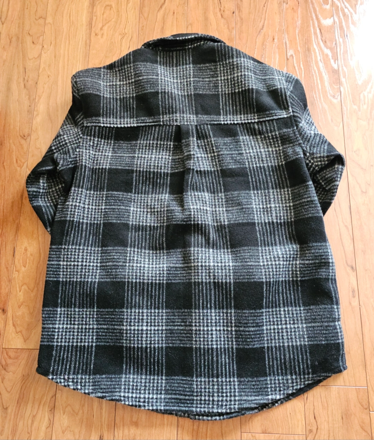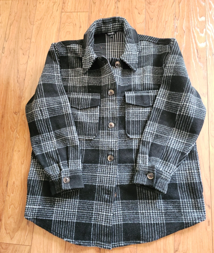 Long-sleeved button-up shirt jacket. Black and grey plaid pattern. Two chest pockets. Heavy duty warm fabric.