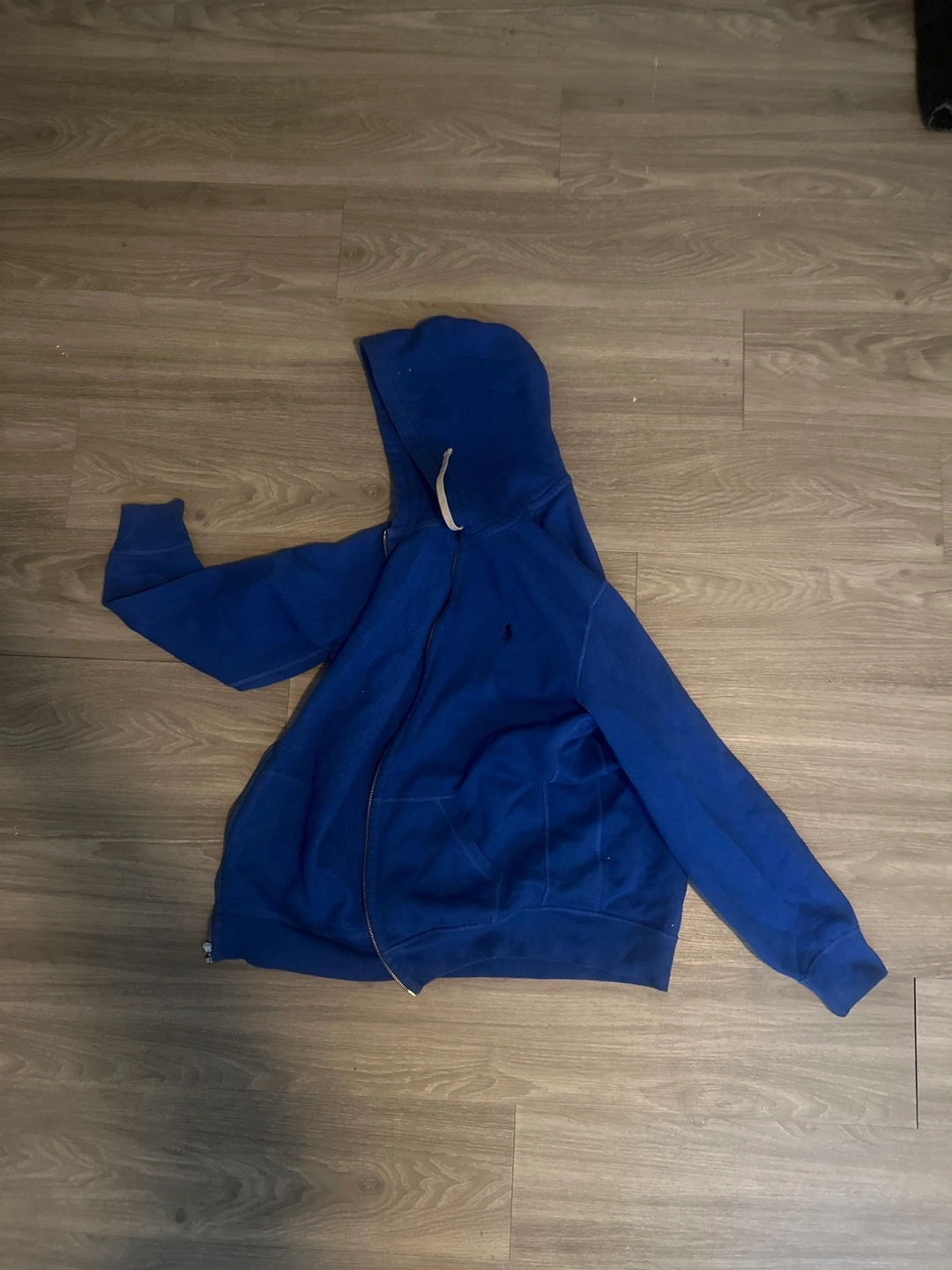 Pre-owned men's zip-up hoodie. Royal blue colour. Features a hood and front pockets. Good for layering or casual wear.