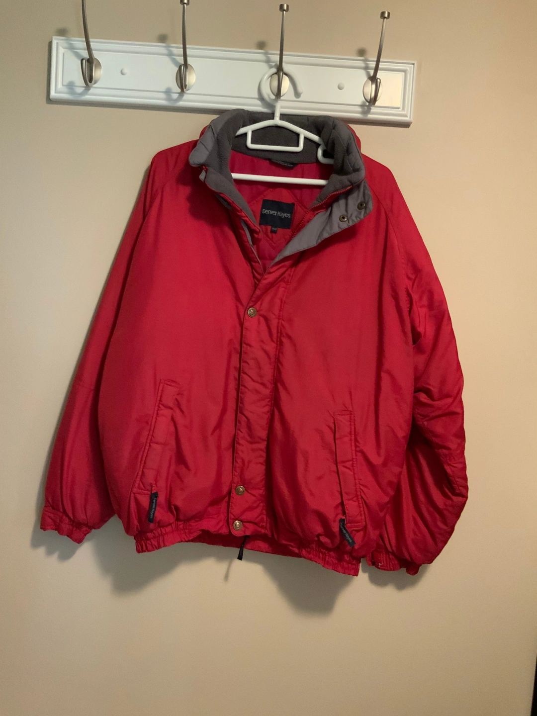 SW Woodlands Men's winter coat made by Denver Hayes. Size is large/tall. Red in color with grey collar. Outside pockets as well as 2 inside pockets and one of those being for a cell phone. Coat closure is zipper and snaps. In great shape! $30.00 Cash Only. I do not do e-transfers.