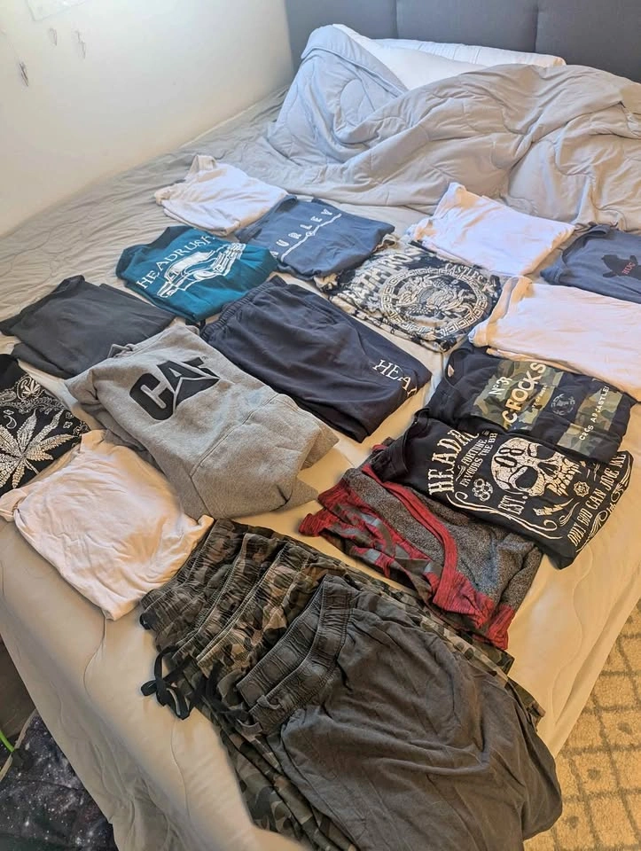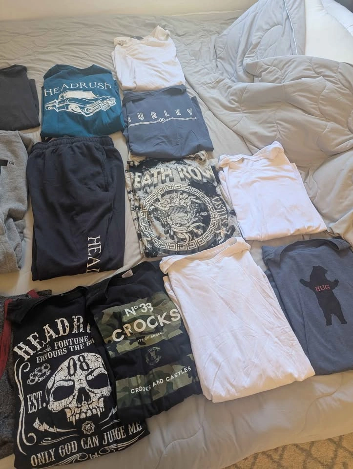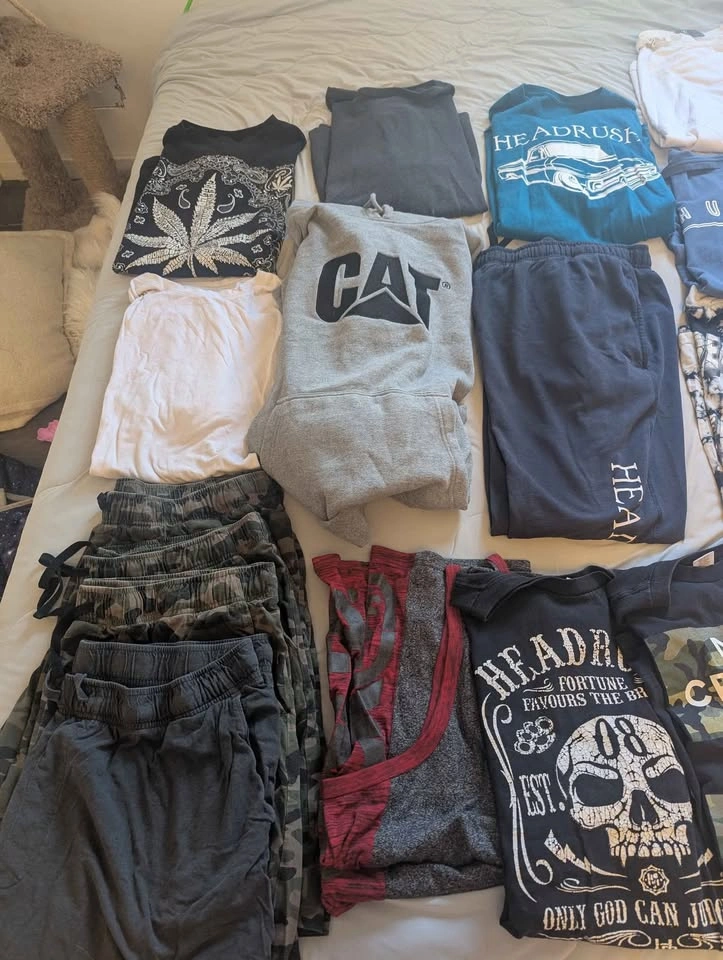 12 t shirts 1 white long sleeve 4 shorts 1 CAThoodie (brand new) 1 pair of sweats Porch pick up in Sherwood park