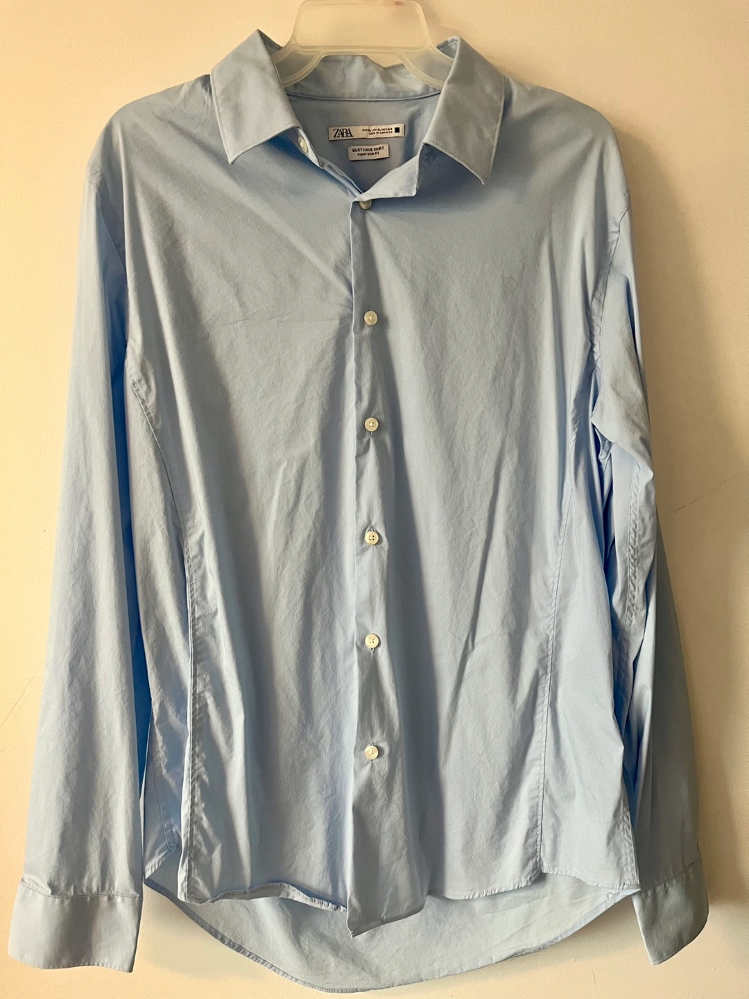 Selling a ZARA light blue, long-sleeved shirt in size small It's a 'Must Have Shirt' with a super fit. Perfect for a relaxed, casual look! Pickup and cash only