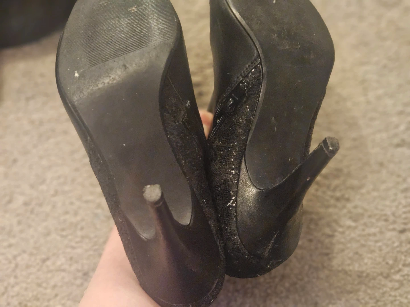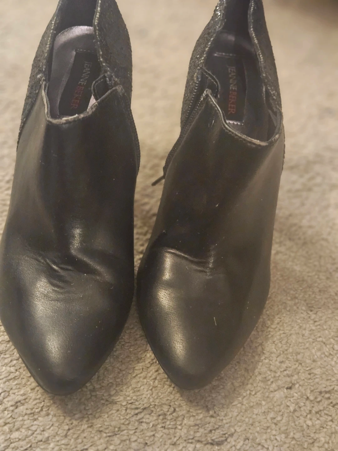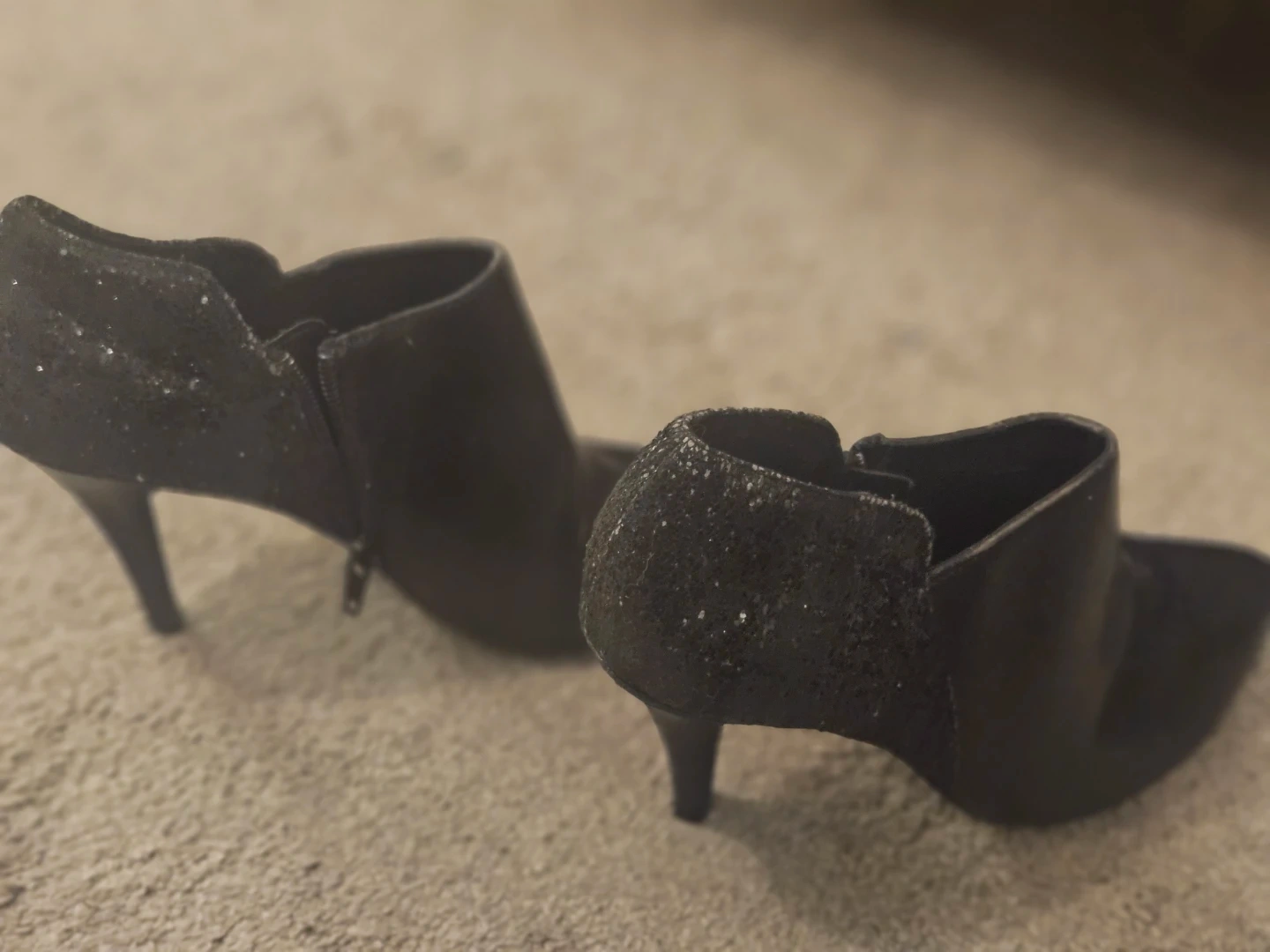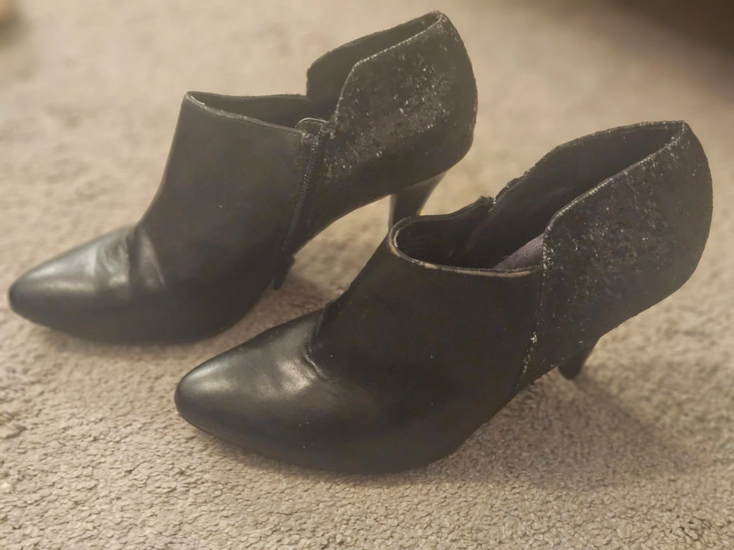 Classic black ankle boots with a sparkly glitter accent on the heel and back. Zipper closure for easy on and off. Heel height is approximately 3 inches.