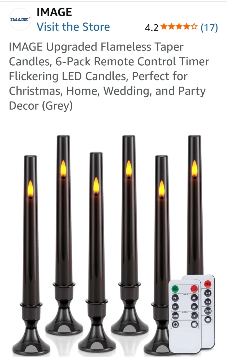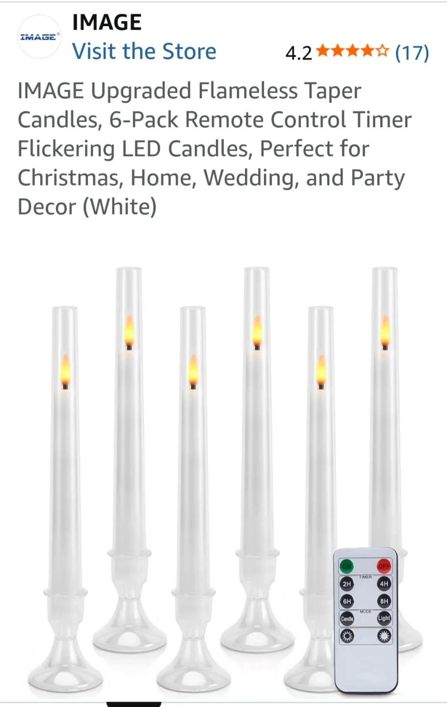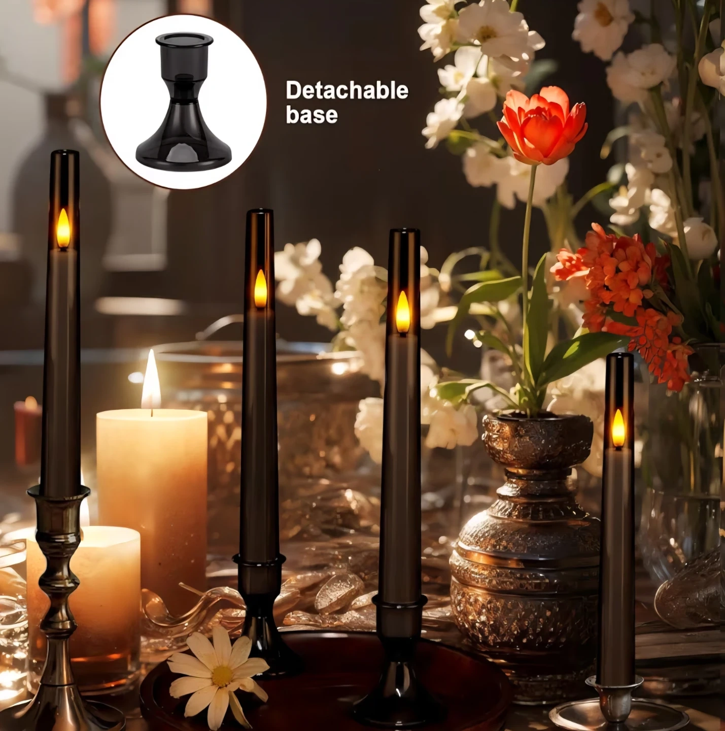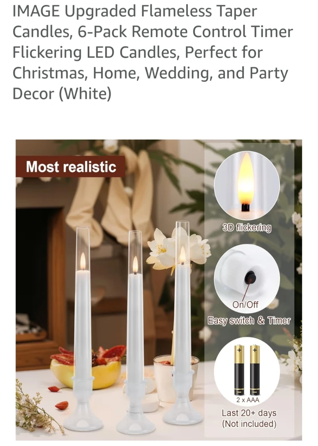This 6-pack of flameless taper candles offers a realistic flickering effect. They come with a remote control for easy operation and a timer function. The bases are detachable for versatile display options. These candles require 2x AAA batteries, not included, and last 20+ days.