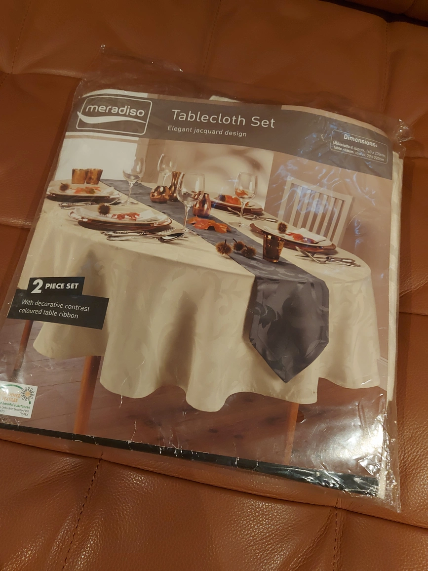 I'm selling a Meradiso tablecloth set with an elegant jacquard design. This is a 2-piece set that includes a decorative contrast-coloured table ribbon. The tablecloth is approximately 160 x 220 cm, and the table ribbon is approximately 20 x 220 cm