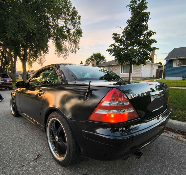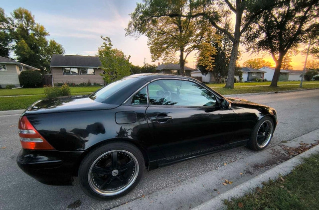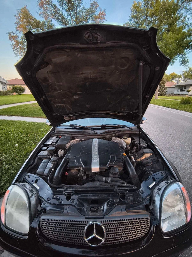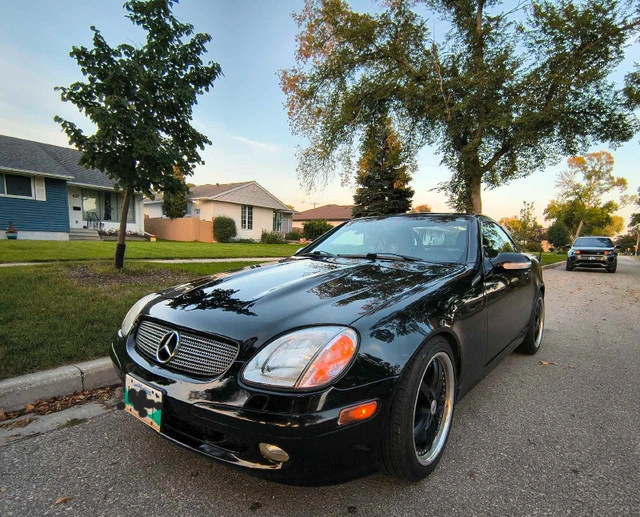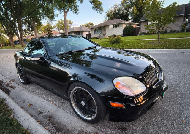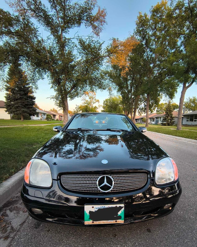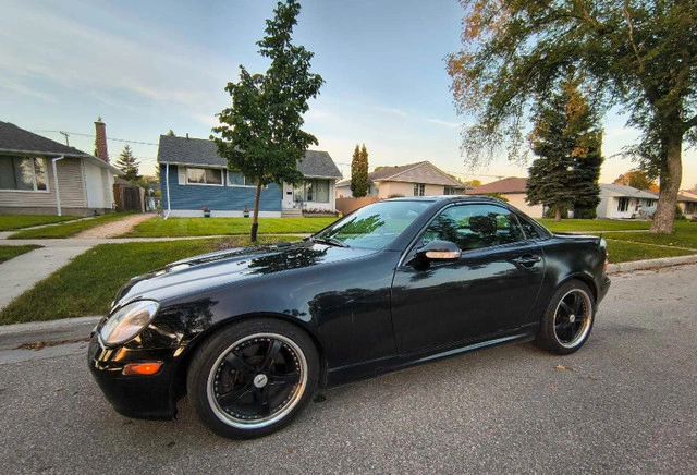 2001 Mercedes SLK320 3.2L V6 - Automatic - Black - Coupe/ Convertible (Hard Top Down) - Around 207500km mileage - Eye Catching on the road. Selling for a relative - Not Safetied (selling as is). My wife's uncle owned it. We already enjoyed enough to experience this awesome Convertible vehicle. Condition of the vehicle: around 7-9km/L average fuel consumption within the city of winnipeg. Just One Key available - no automatic unlock/lock - upgraded to radio with Bluetooth - Boss Sound System - Some rust on the antenna area. Breaks and rotors looks new. Done changing engine oil, brake fluid, coolant and air filter. No engine light. One light problem on driver side mirror but you can buy new side mirrors from rockauto an ordinary mirror (roughly 20$each side) to stick on the side mirrors(if you are not comfortable with it). Aside from those information, it is on your standard and safety inspection. Meet me in East Kildonan