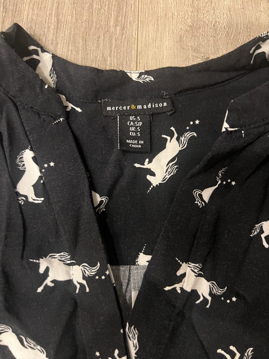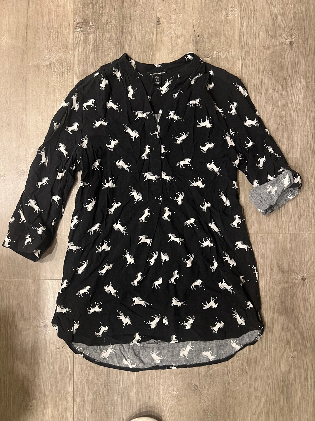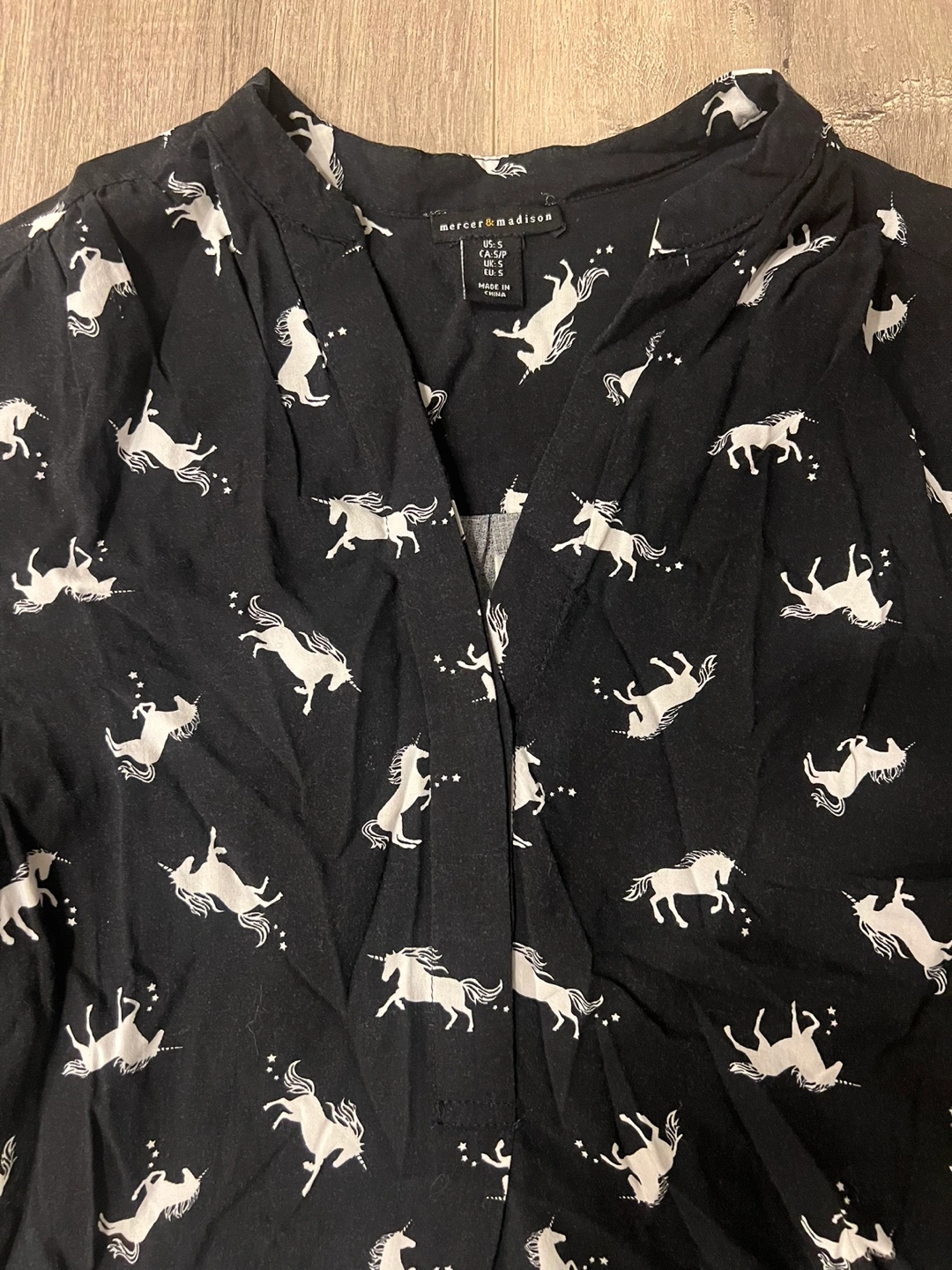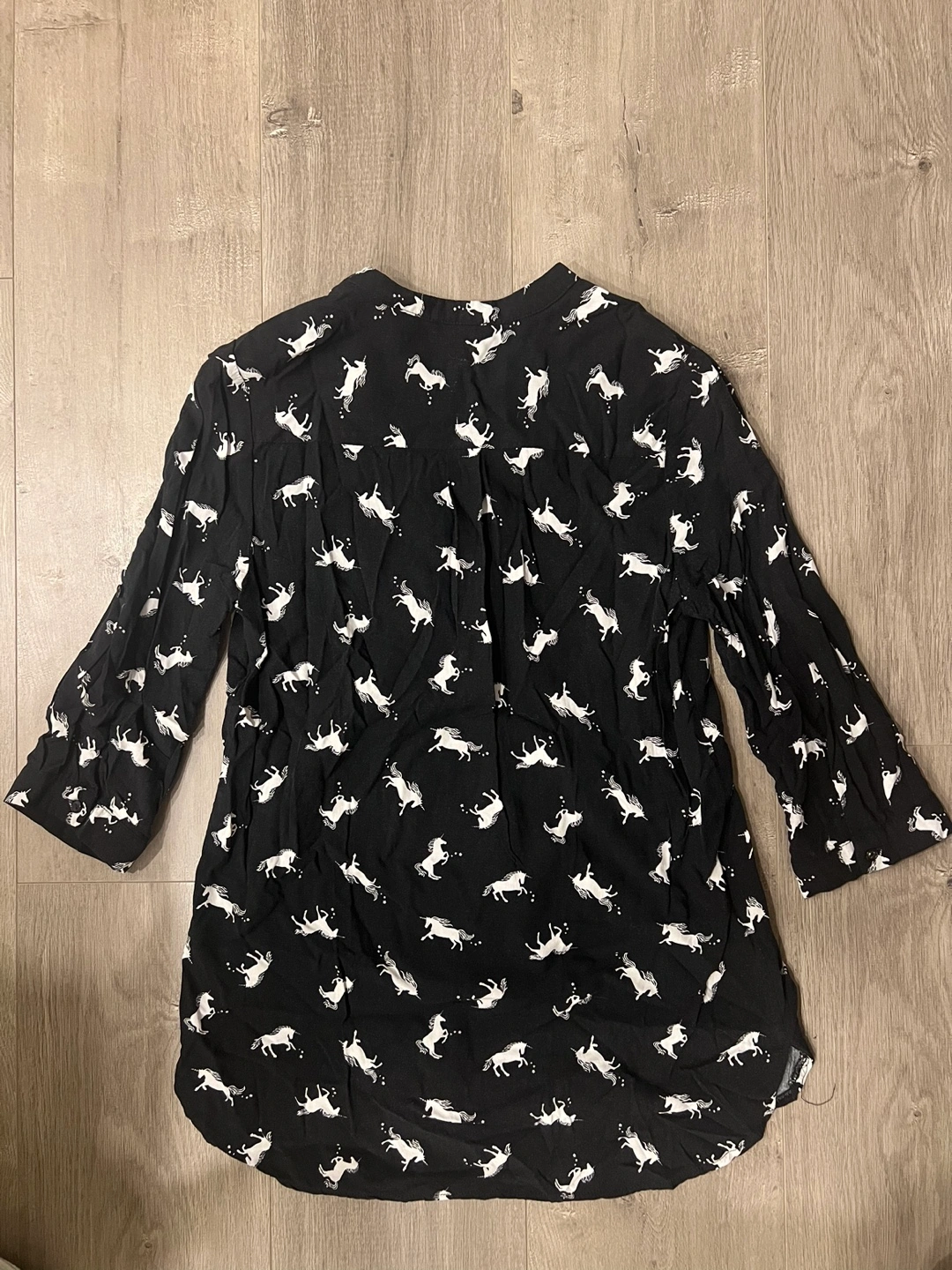 Black and white blouse with a unicorn print. Three-quarter sleeves. Button down. Size Small.