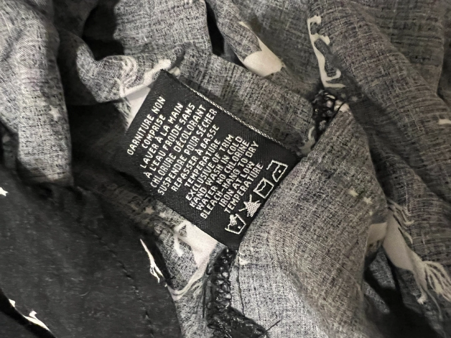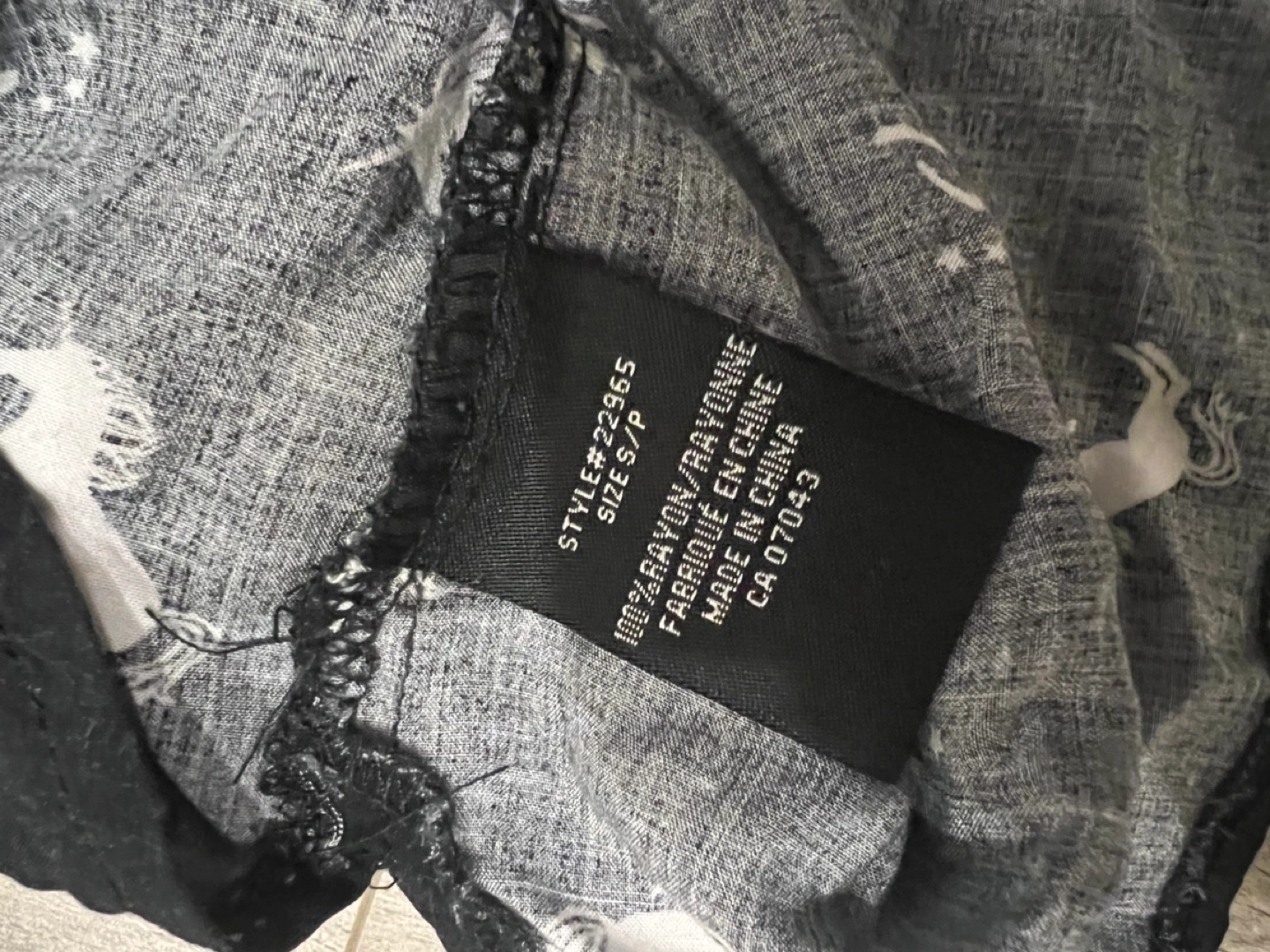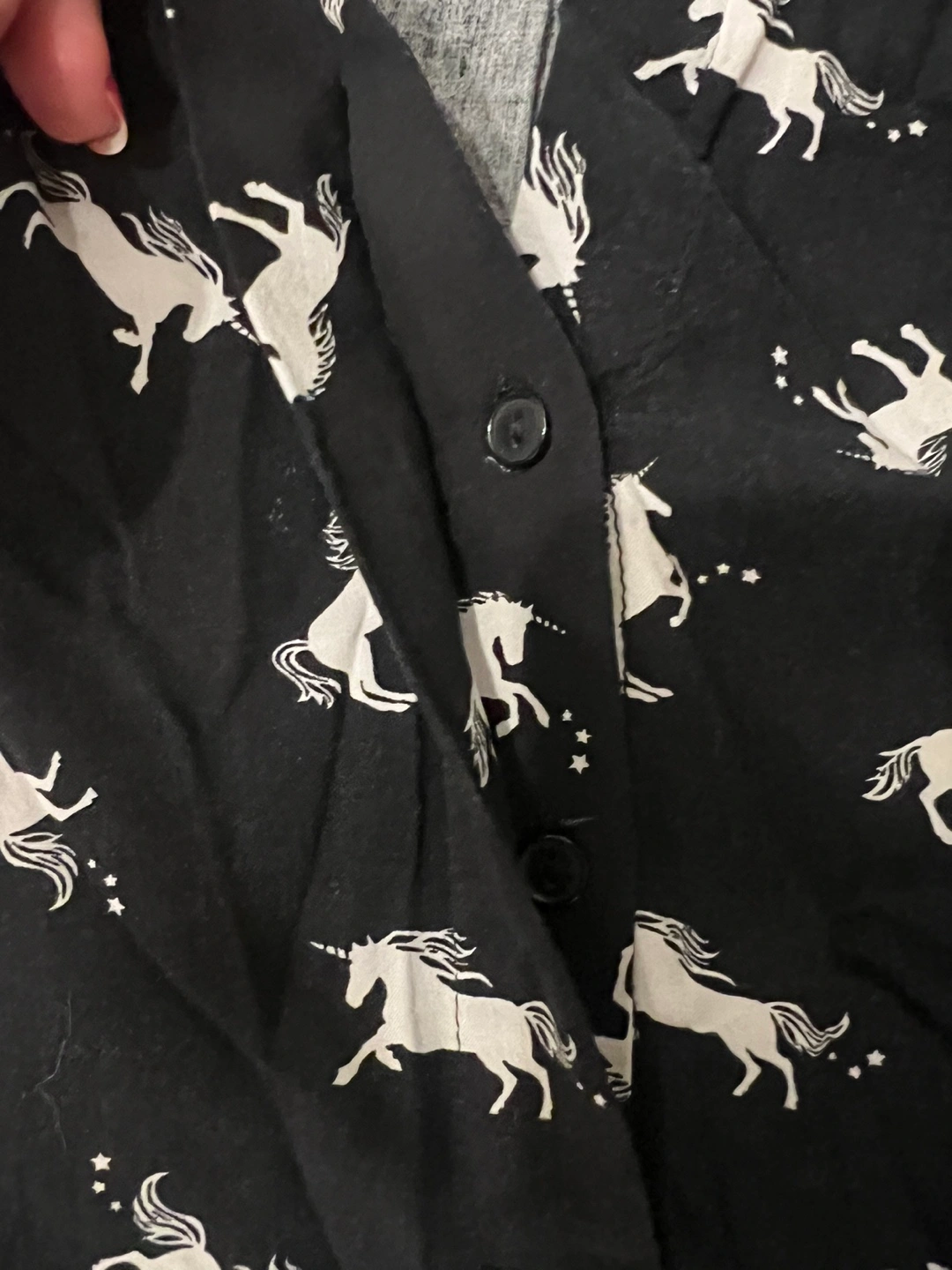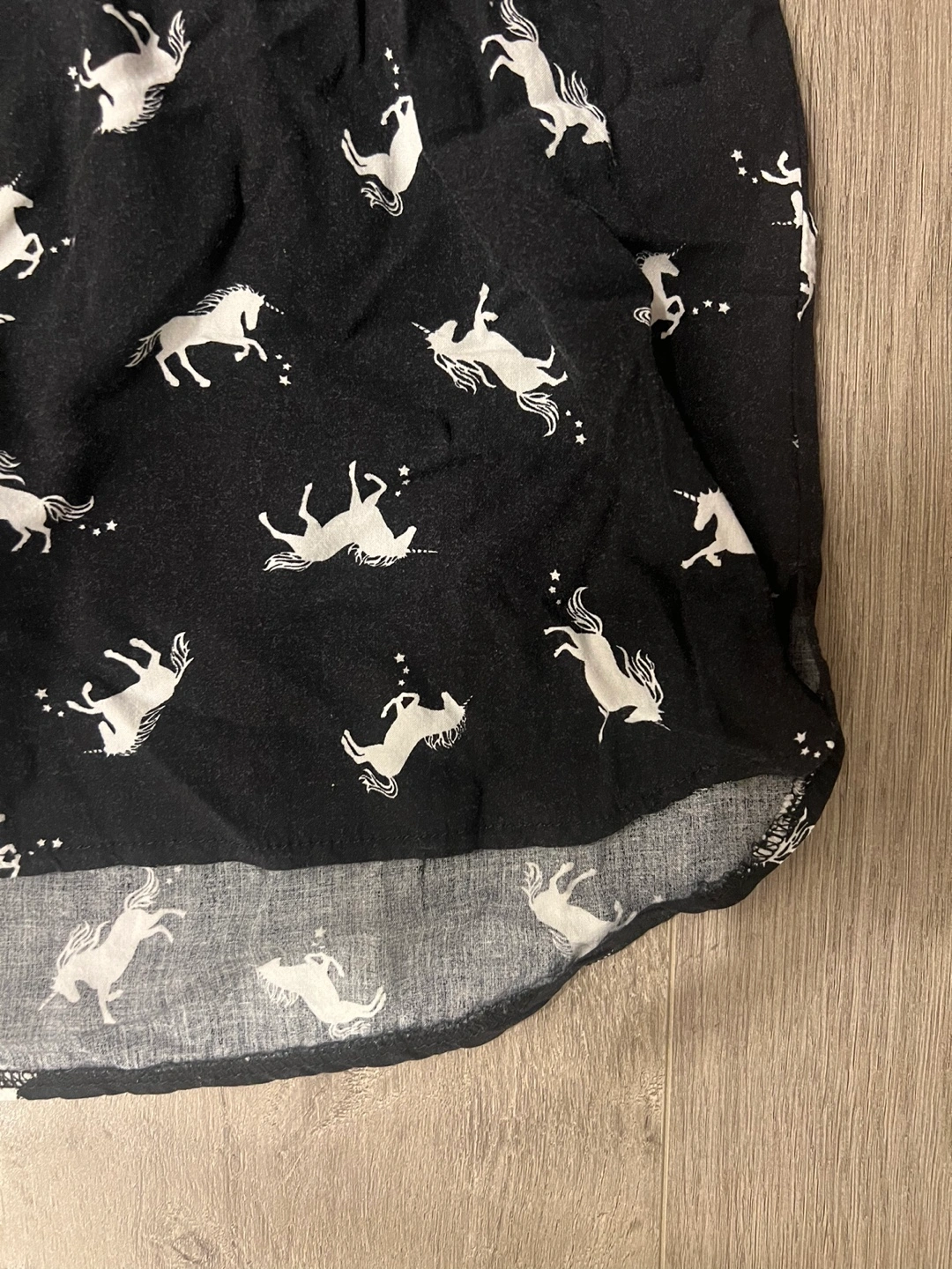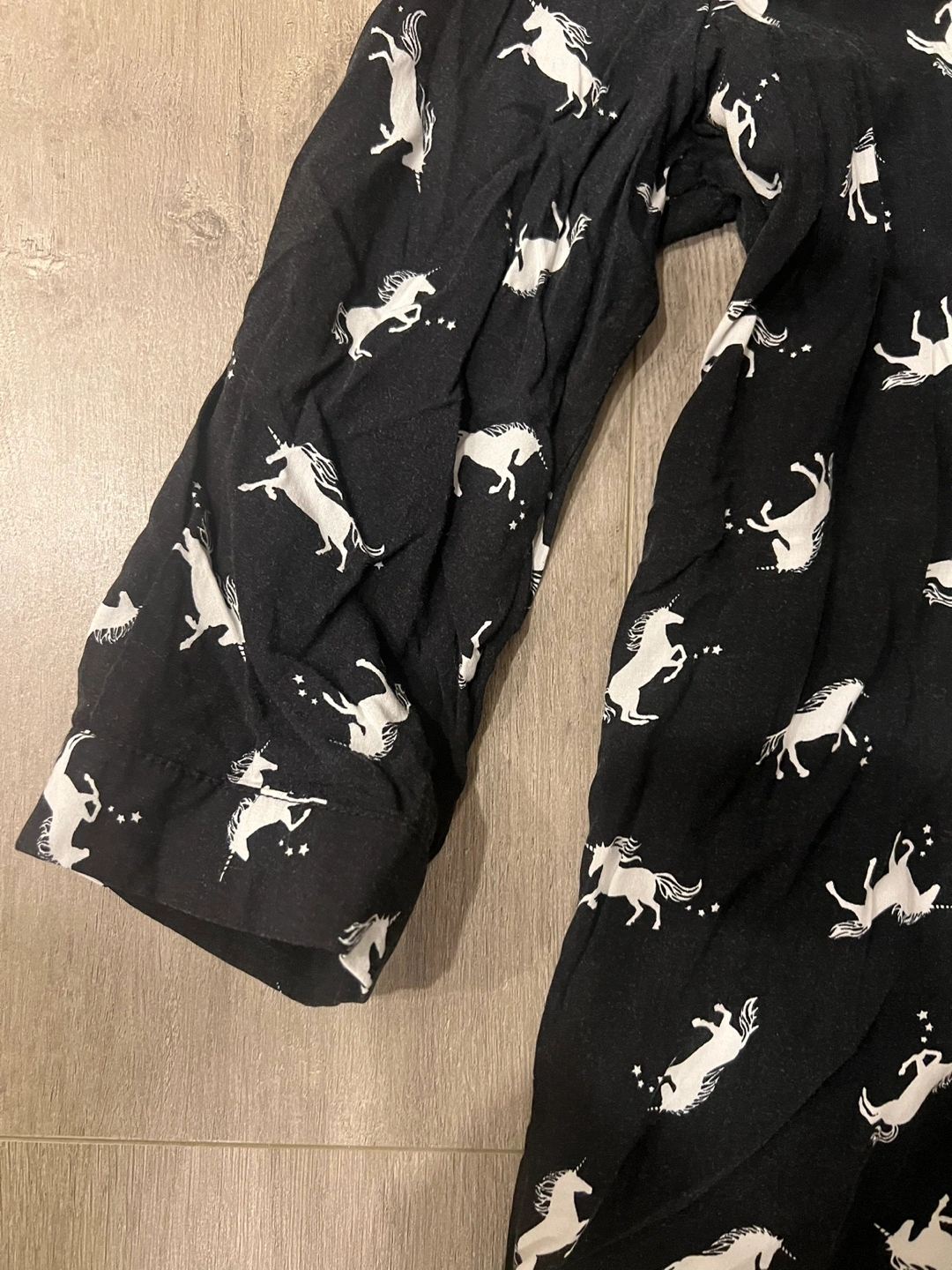 Black and white blouse with a unicorn print. Three-quarter sleeves. Button down. Size Small.