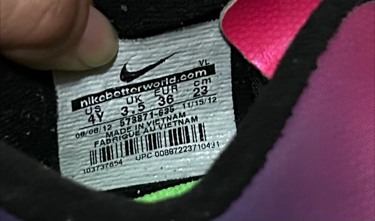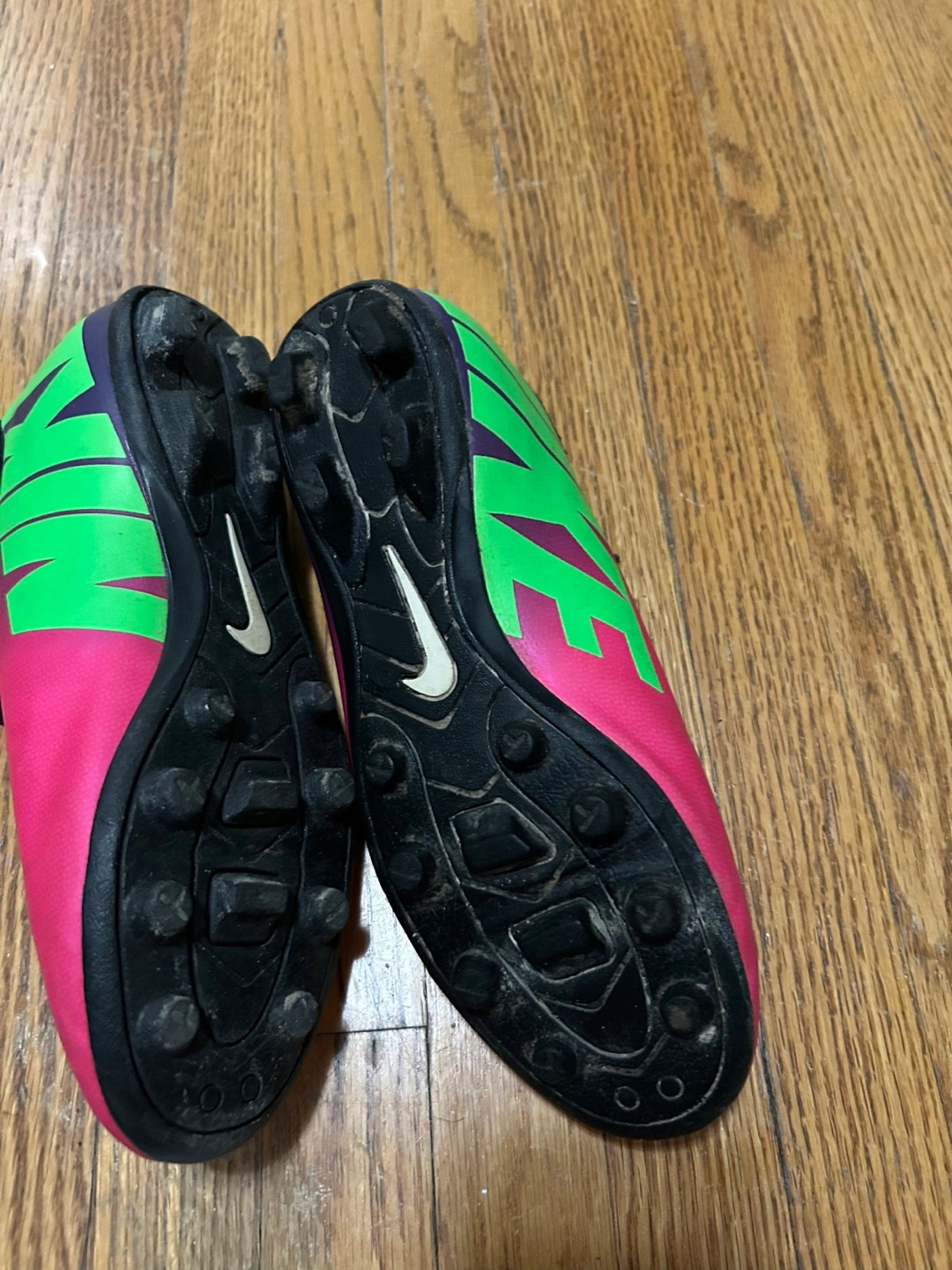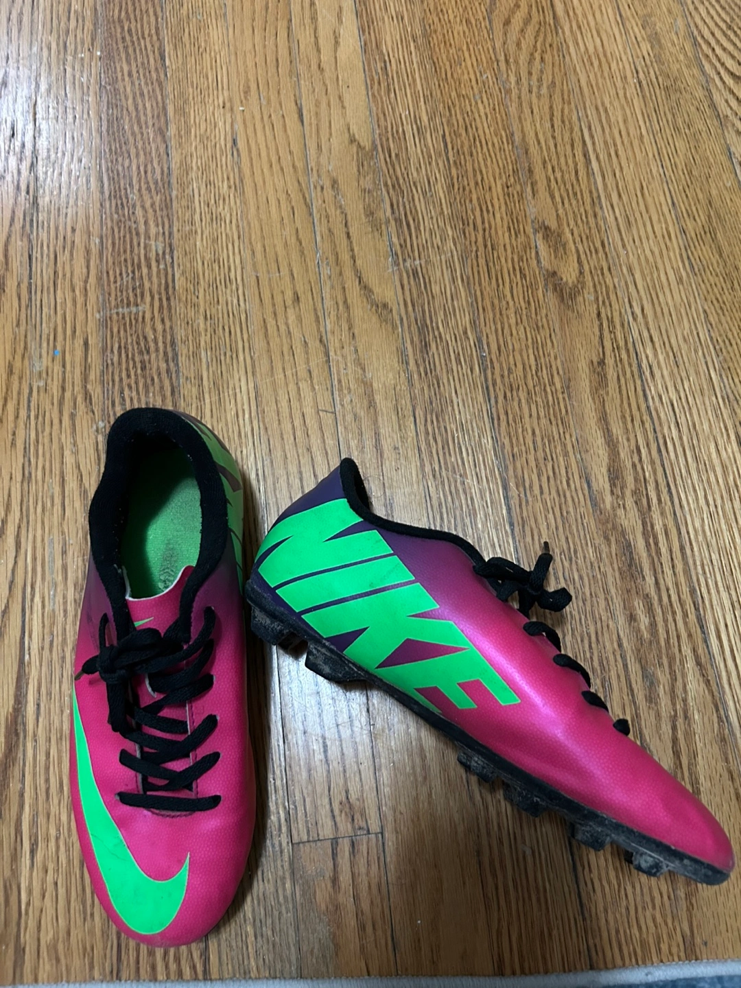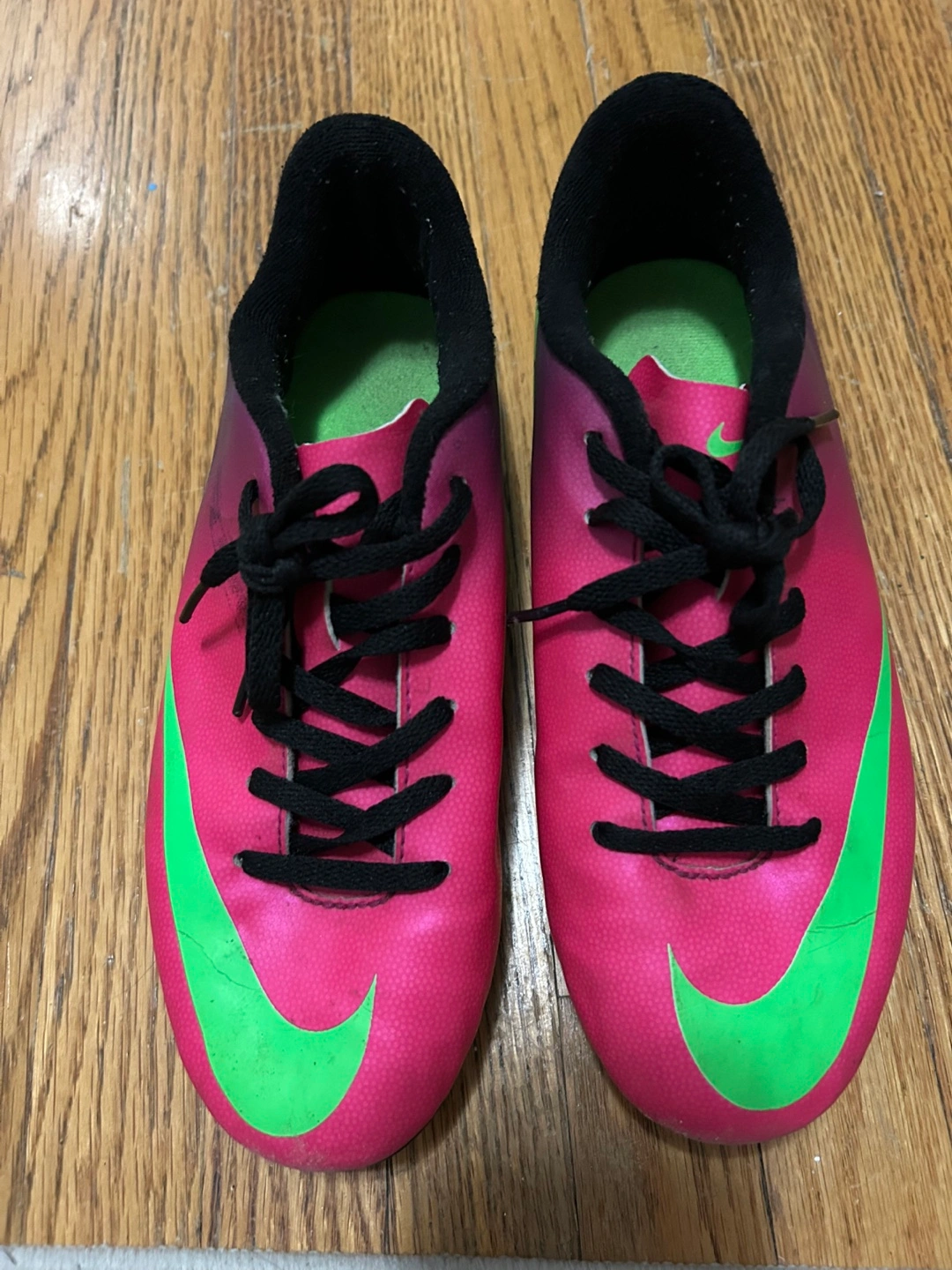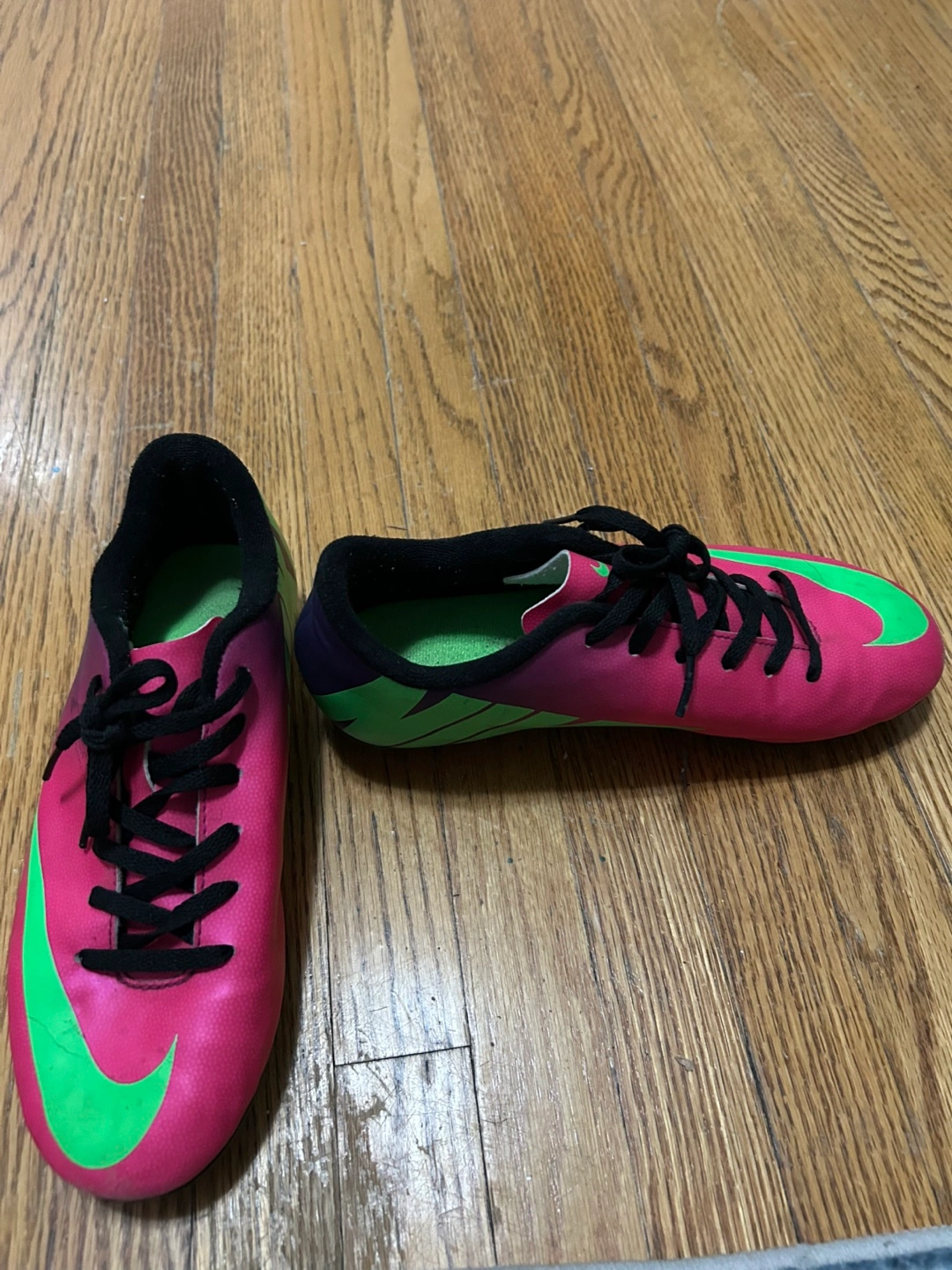 Mercurial Nike soccer shoes in a vibrant pink and lime color combo! They are in used good condition, as shown in the photos. The size is US 4Y, UK 3.5, EUR 36, and 23 cm. CASH ONLY!