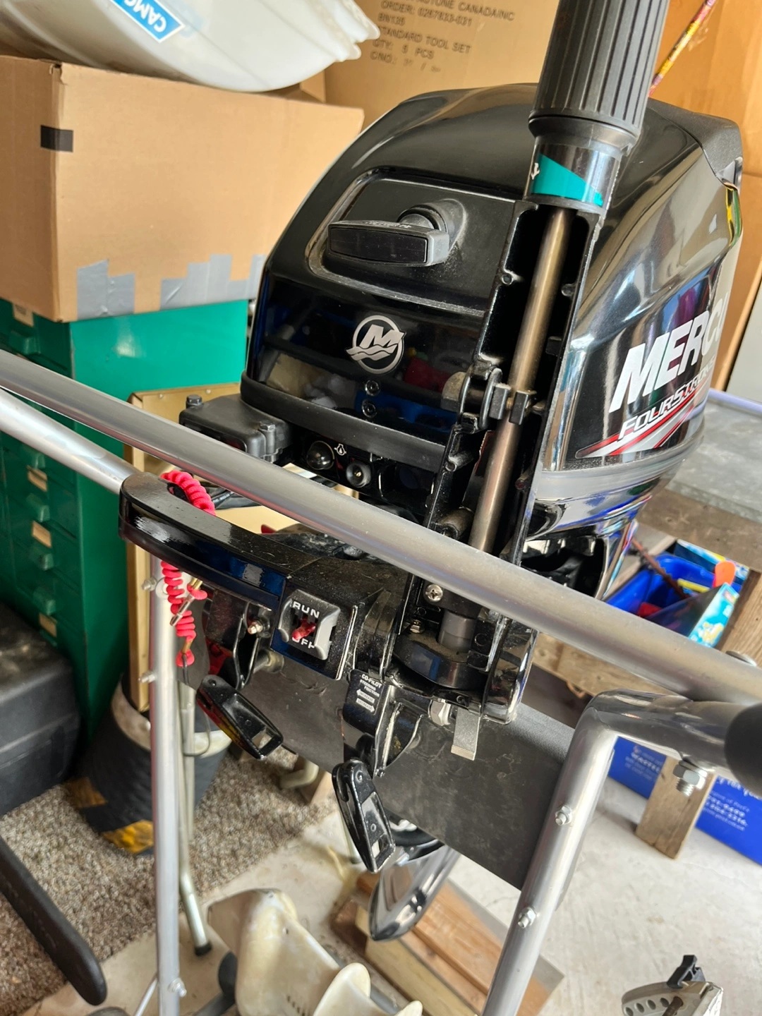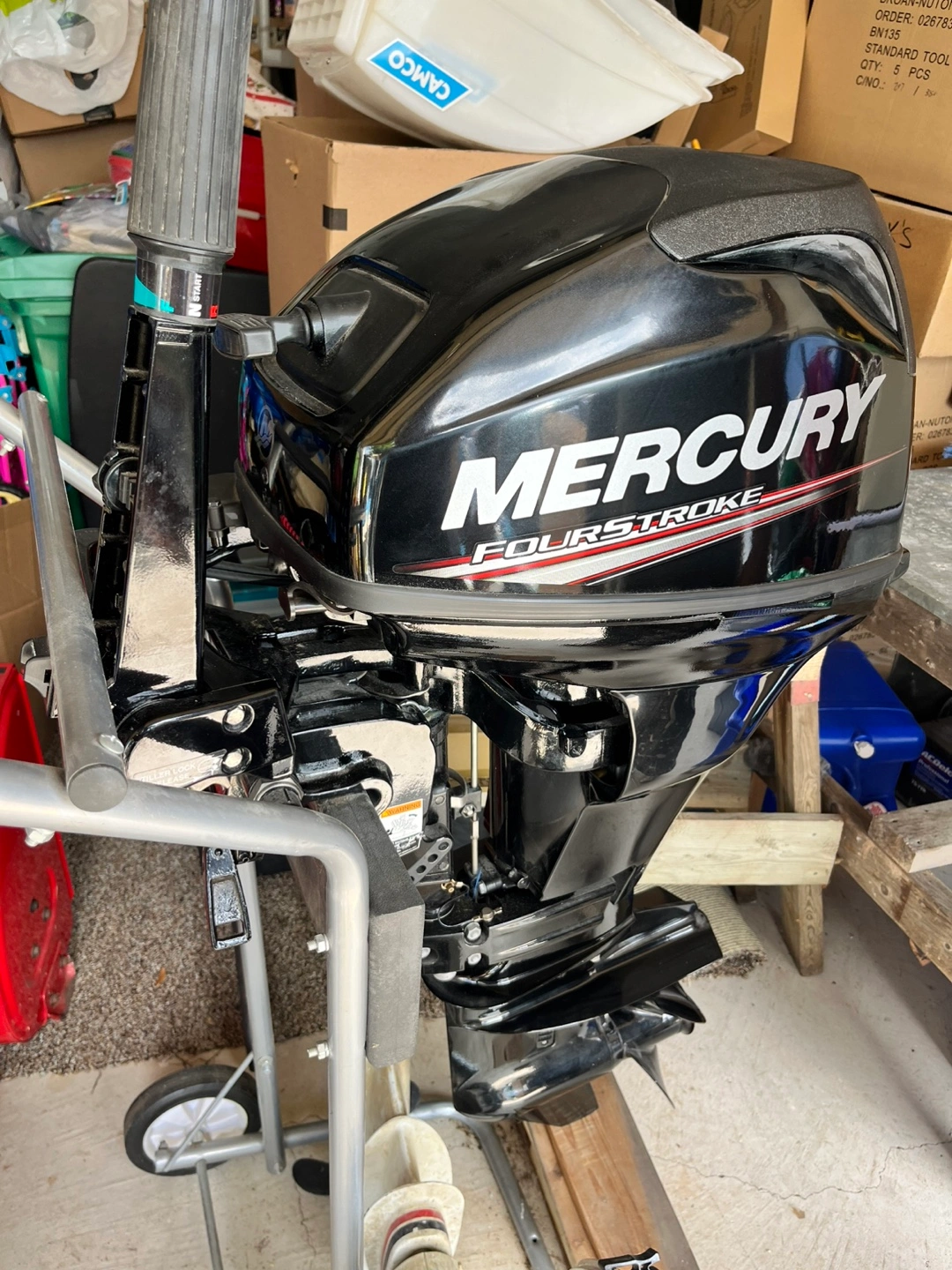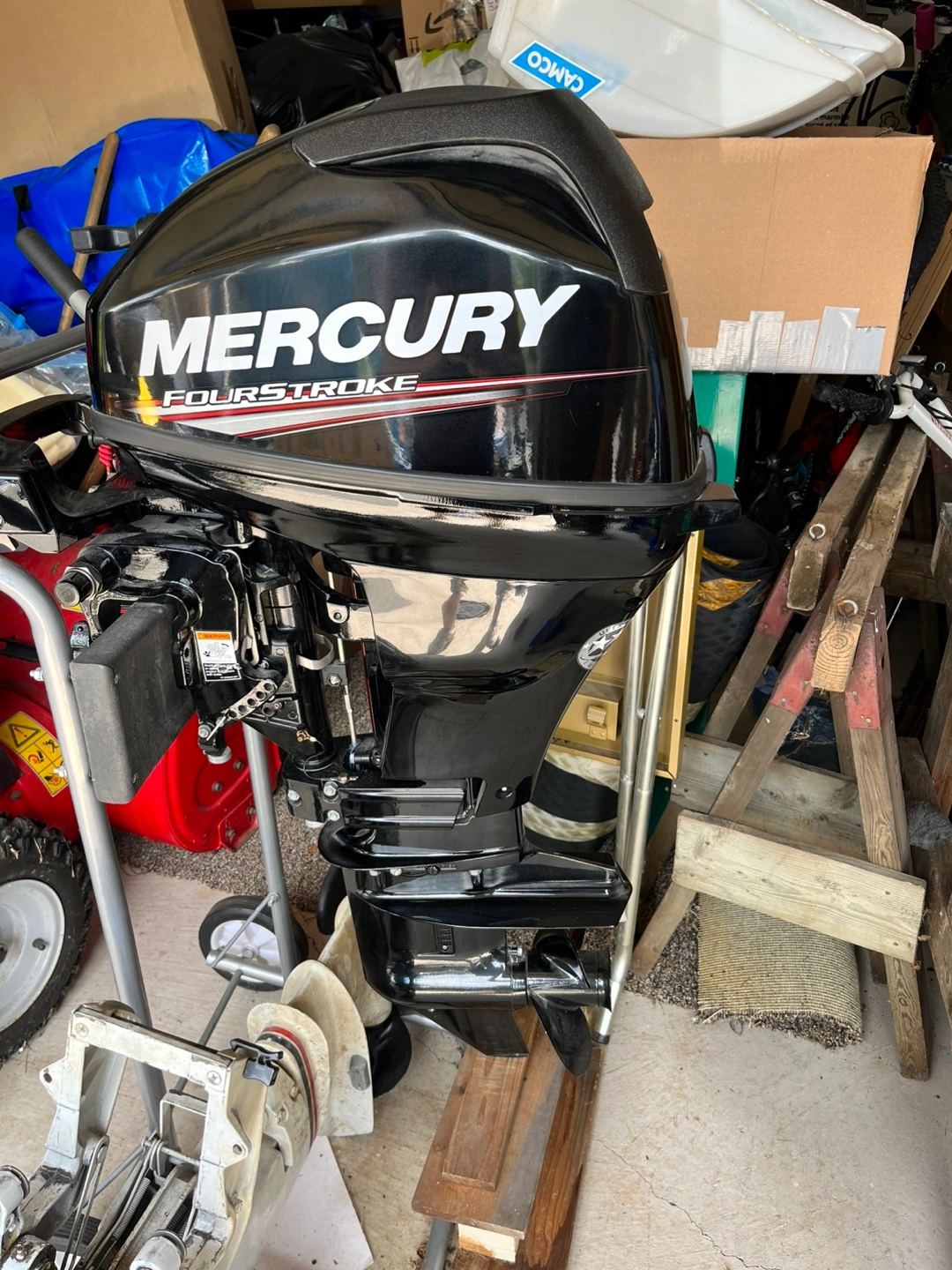 20 horsepower Mercury fourstroke outboard motor. Black in colour. good condition. Includes propeller and mounting bracket. Only saw water once