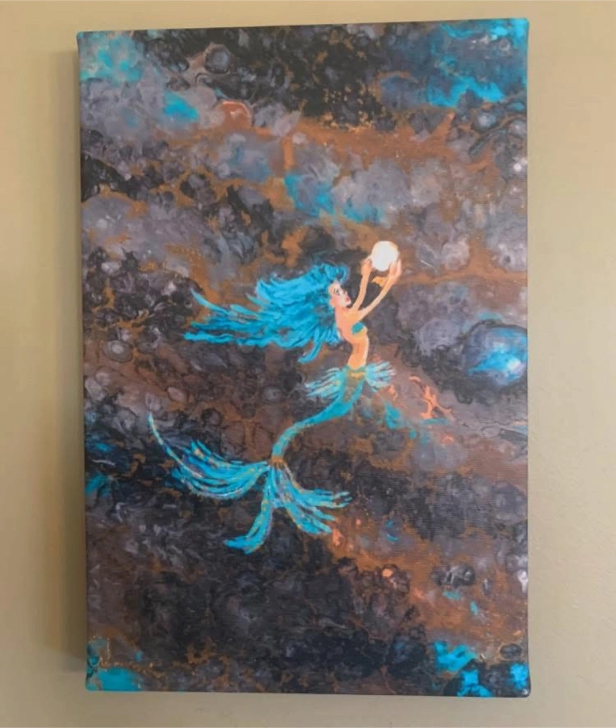 55Gorgeous canvas wall art print. Features a mermaid with blue hair and tail. Abstract background in teal, brown, and black. Unique piece for home decor. Print of handmade artwork from local artist Creations by Jo-Jo on facebook. A beautiful addition to any home. Artist willing to deliver locally, cash only.