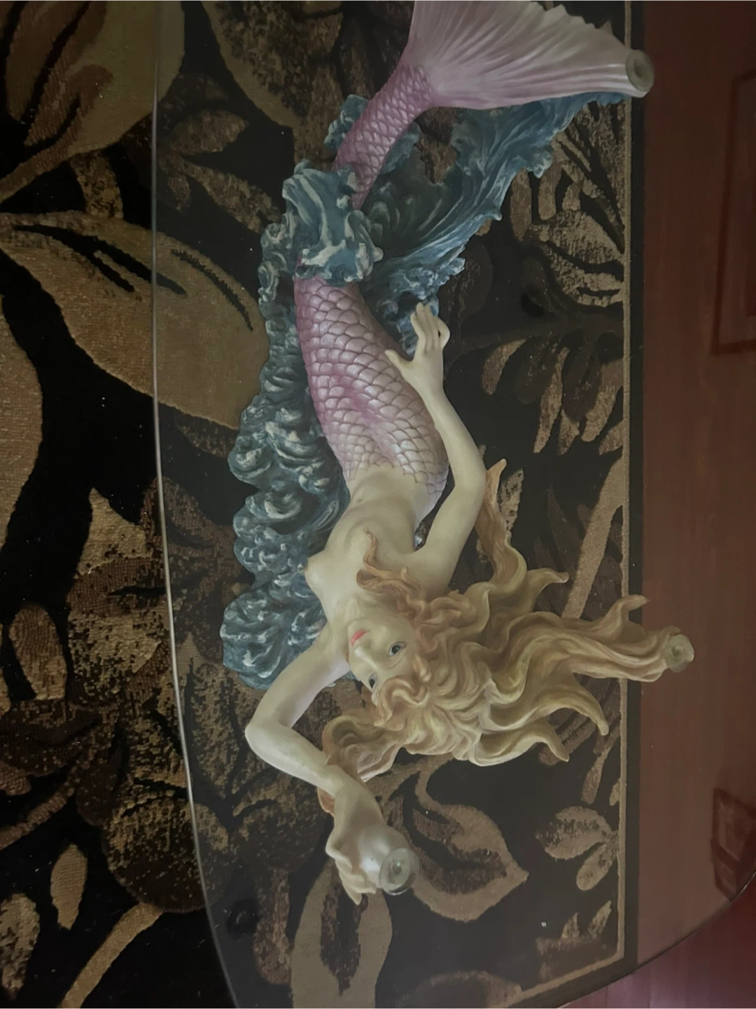 A beautiful mermaid figurine in excellent condition. The details are lovely, from the scales on her tail to the flowing waves. Perfect for adding a touch of whimsy to any room