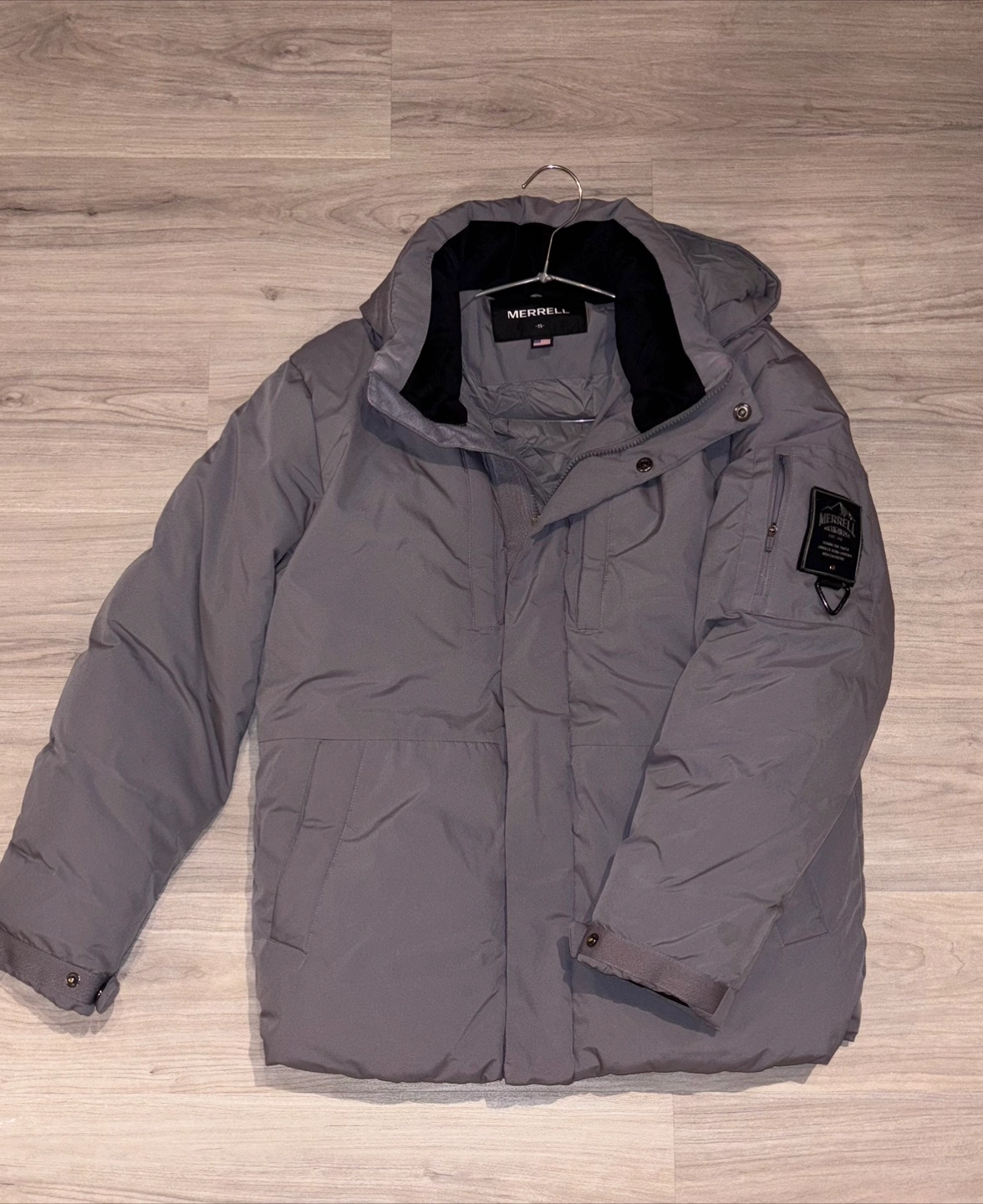 Selling a Merrell winter jacket in a stylish grey colour. It's super super warm and not too heavy! Great for unisex. It's in great condition - only be aware of the little mark near the bottom of the sleeve as you can see it in the photo.