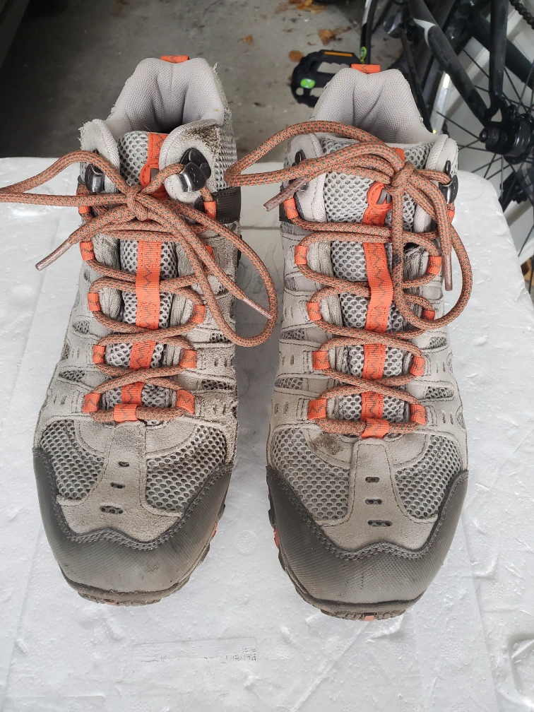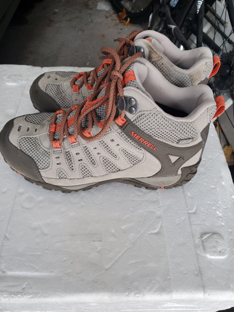 41Lightly used Merrell hiking boots. Grey and orange. Good condition, some minor wear. Women's size 7 Comfortable and durable.