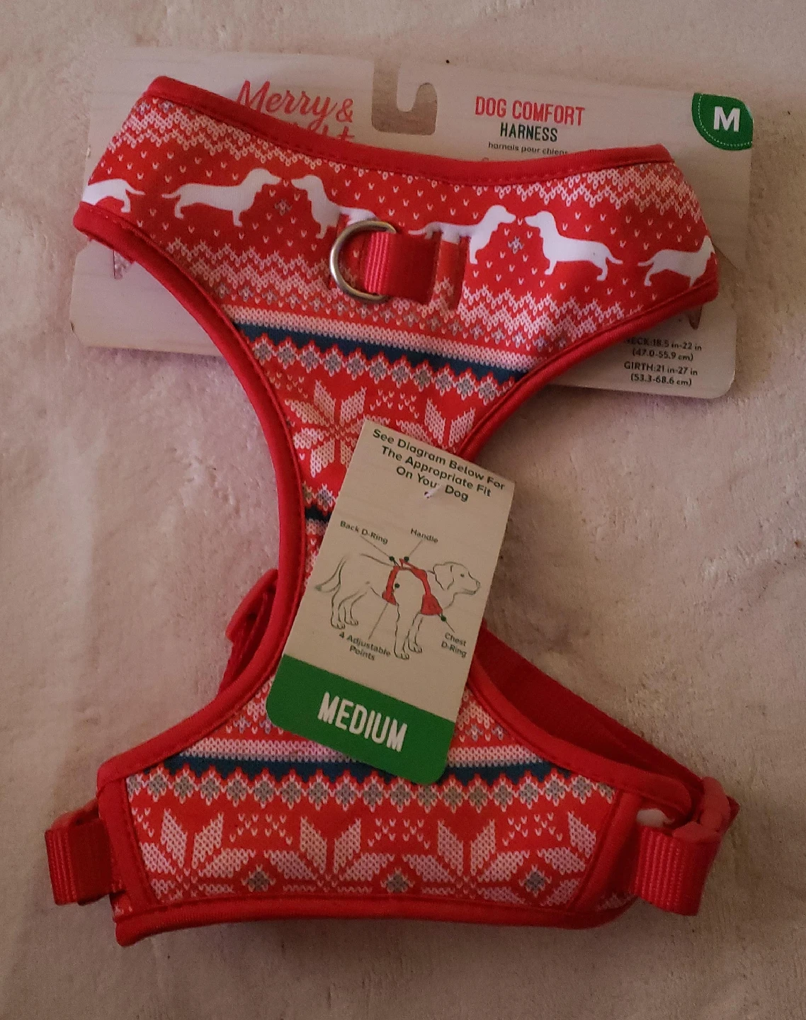 60This is a Merry & Bright Dog Comfort Harness in size medium. It features a festive red and white pattern with dog silhouettes. The harness is adjustable for a comfortable fit. Also included is a black leash to match!