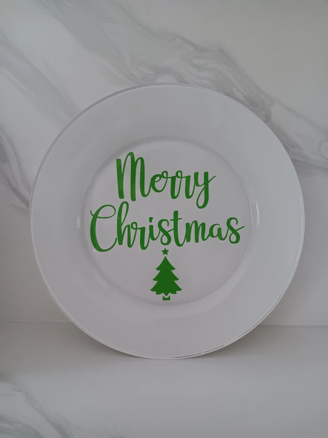 10Festive decorative glass plate with a 'Merry Christmas' design! It's perfect for adding a touch of holiday cheer to your table or as a decorative piece during the Christmas season! DETAILS Plate measures 10.5 inches in diameter, can be customized in colour of choice and is packaged in a box! Pre order yours today to get it in time for Christmas! Plate is solely used for decorative purposes and is not suitable for food. Cannot be used in the dishwasher.