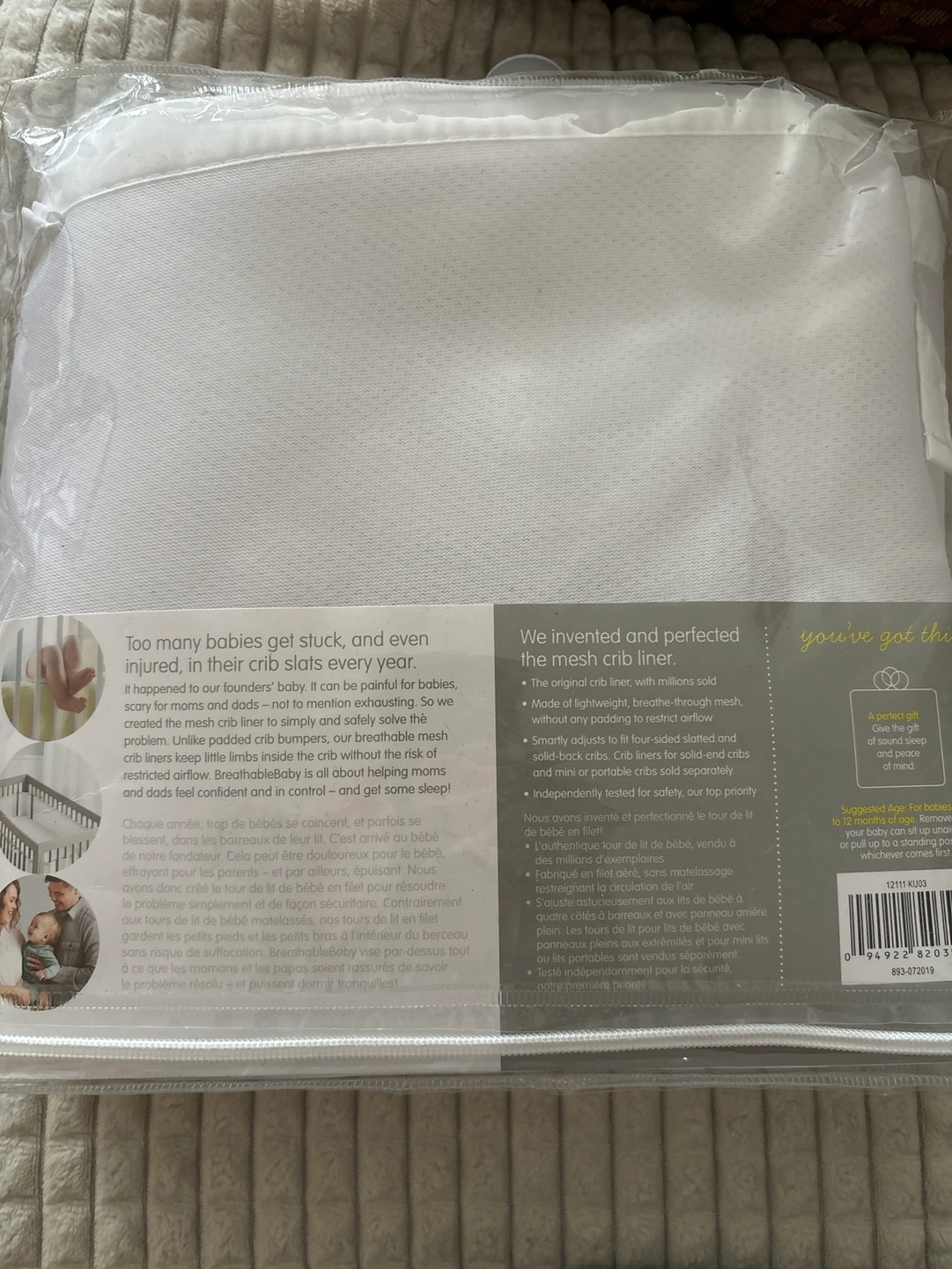 A white mesh crib liner to help prevent your baby from getting their limbs stuck.