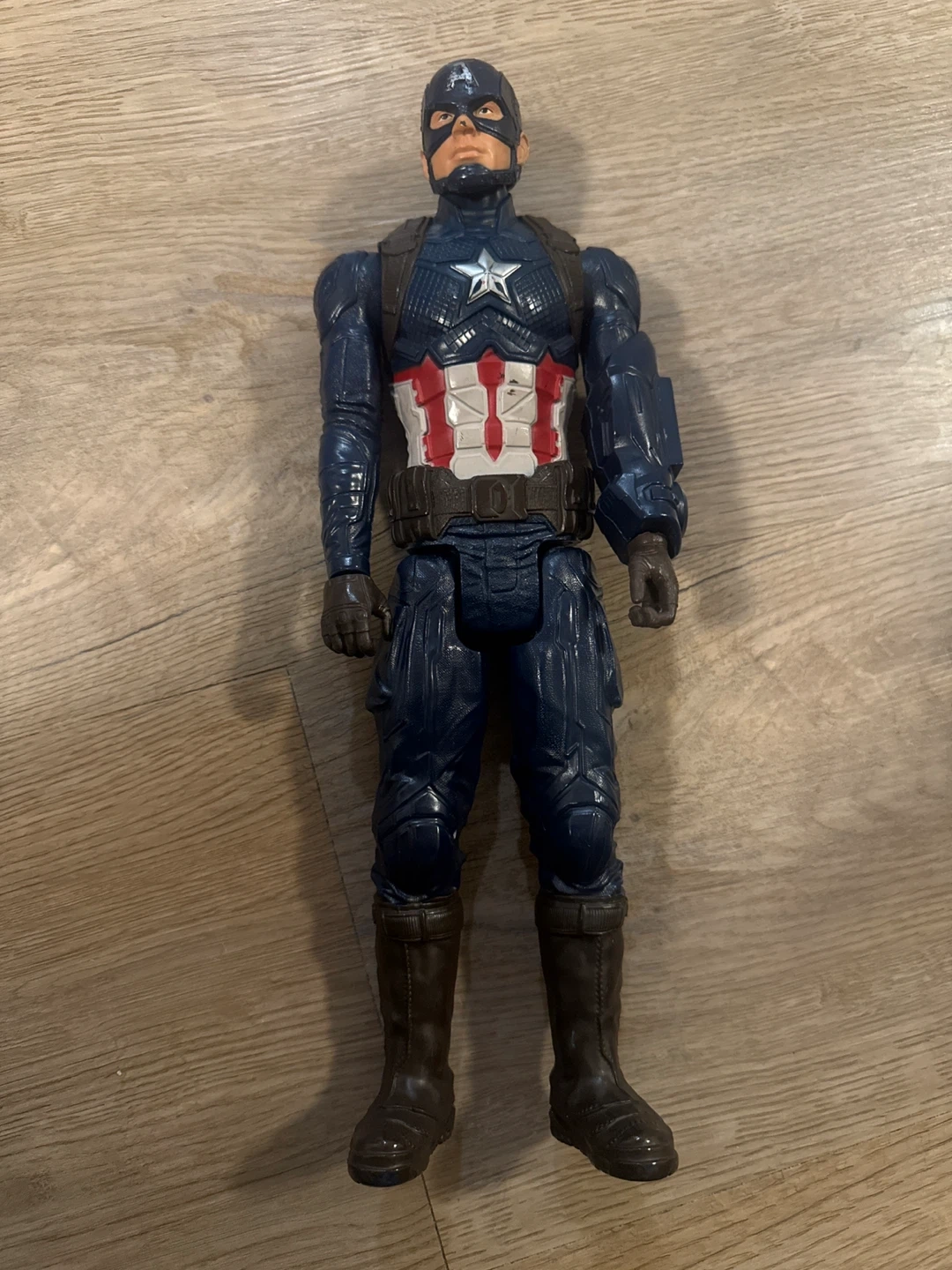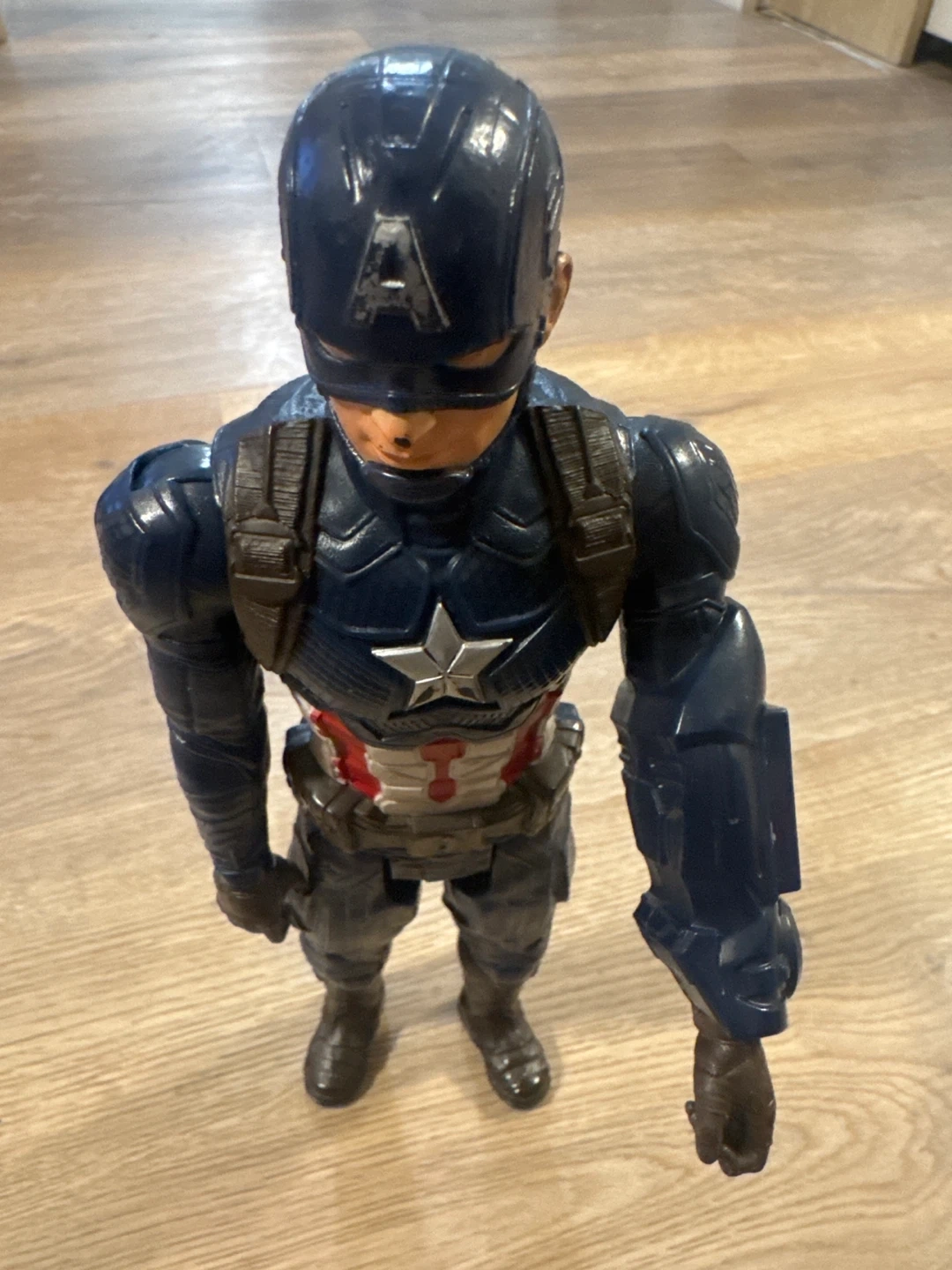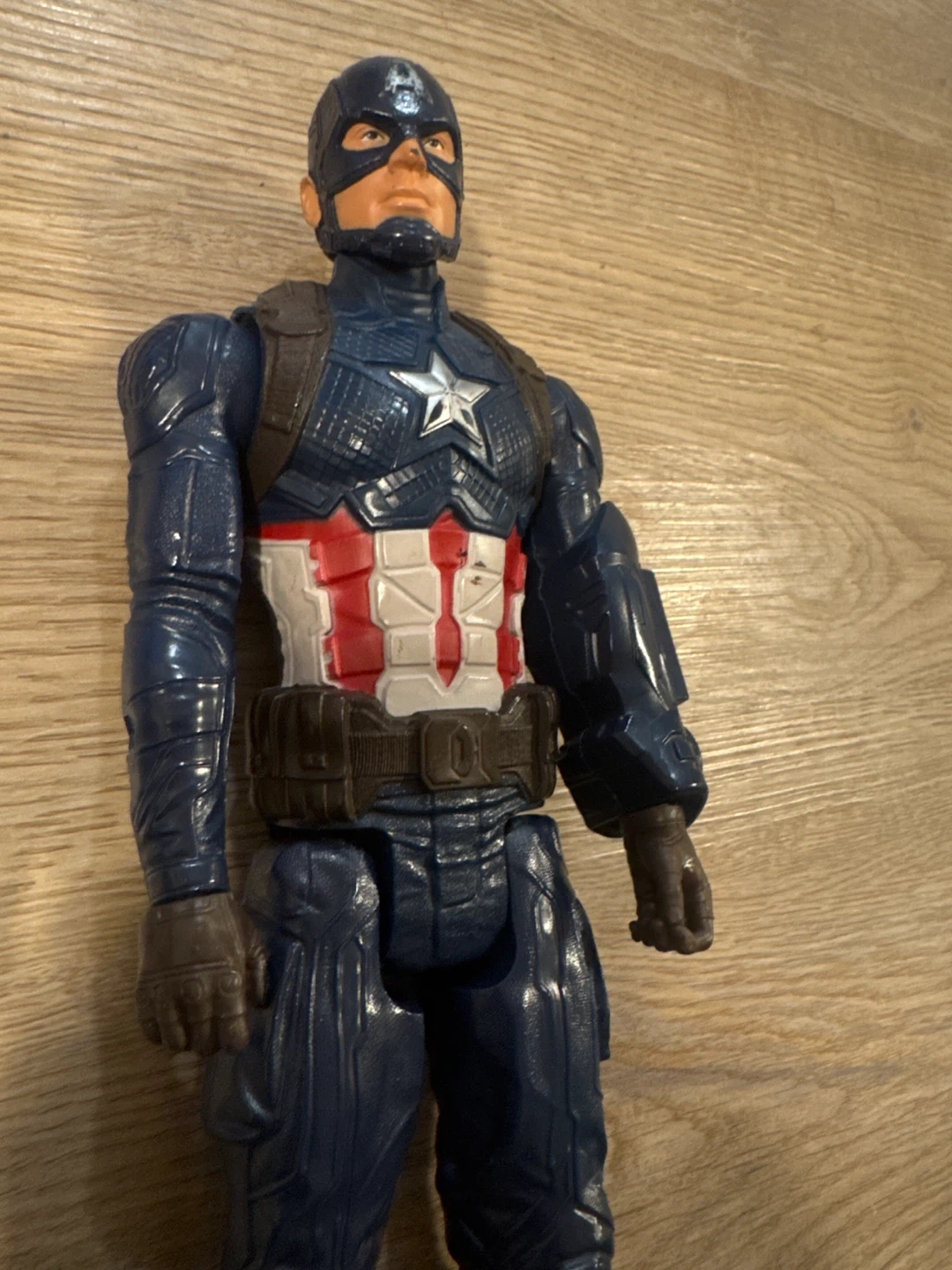 This is a Captain America action figure, perfect for Marvel fans. It's made of plastic and features detailed armour. It's a great toy for imaginative play!