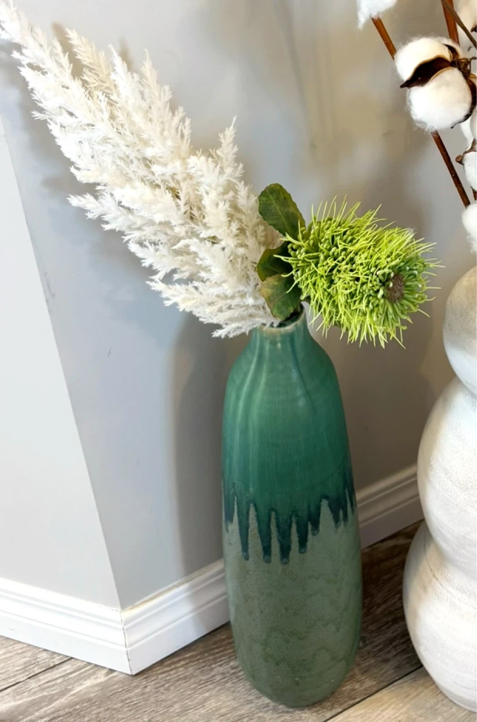 A tall, green ceramic vase with a unique drip glaze effect. It's perfect for displaying dried flowers or as a standalone decorative piece. Made of ceramic material.