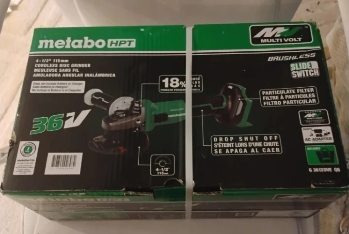 10Selling a Metabo HPT 4-1/2" 115mm cordless disc grinder. It's brand new in the box and includes an AC adapter. The grinder features a brushless slide switch and a particulate filter. It also has a drop shut off feature.