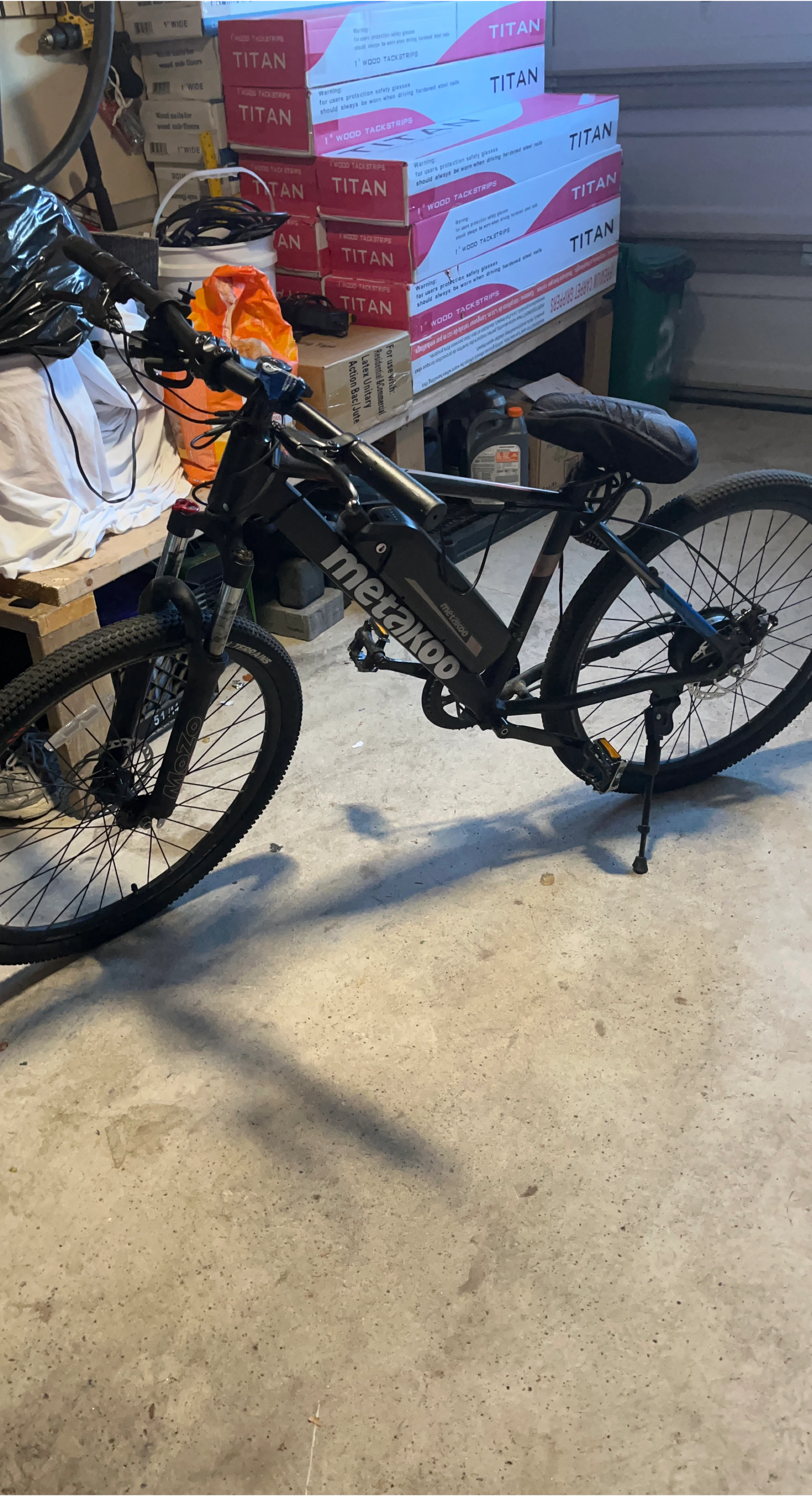 Selling a Metakoo electric mountain bike. It looks like it's in good condition and ready for some trails or city cruising! It has a black frame and standard mountain bike tires. It has upgraded forks