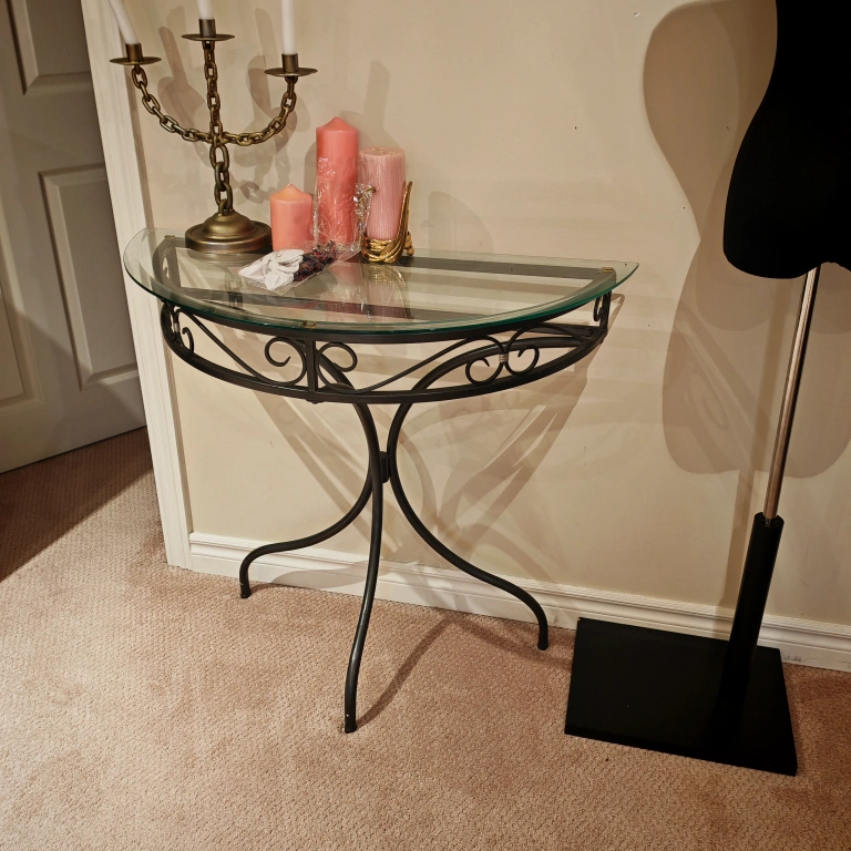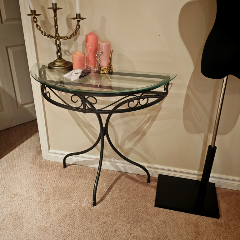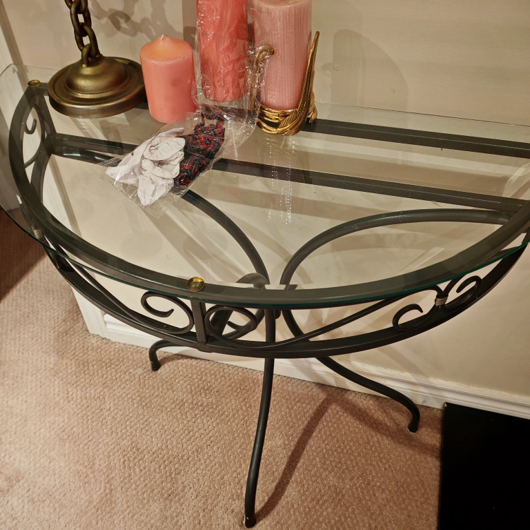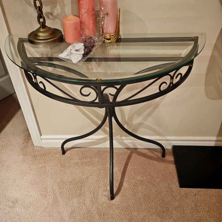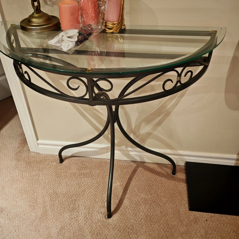 68Elegant console table. Glass top, supported by a dark metal frame. Frame with ornamental scrolls. Such a piece would be a beautiful addition to any entryway, offering a serene space to place decor.