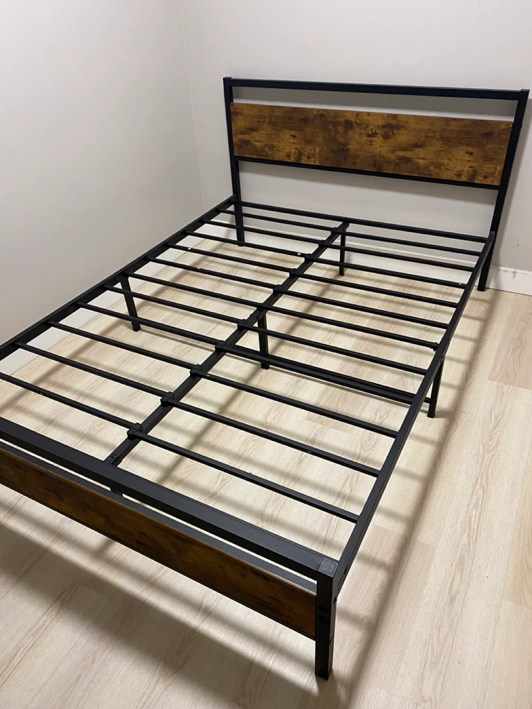 238Selling a bed frame with a metal frame and wood accents. It's in great condition and ready for a new home! The frame is black with a wood grain headboard and footboard fits a double/full mattress