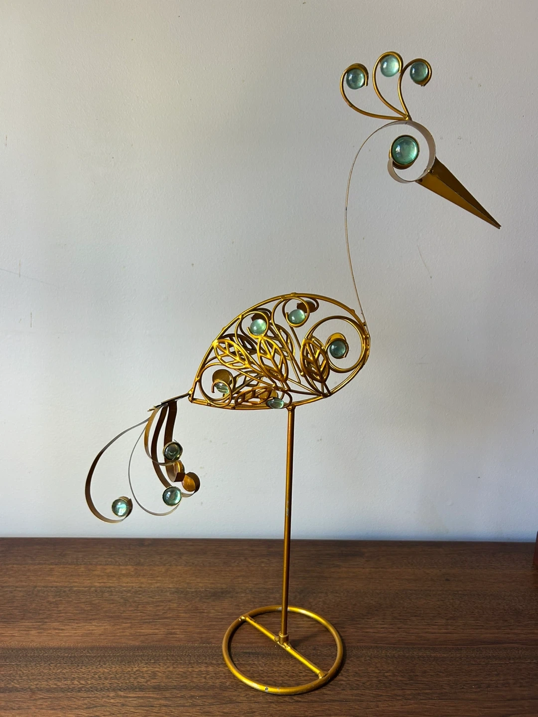 This is a beautiful metal bird sculpture, perfect for adding a touch of elegance to any room. Jewelry is manmade.
