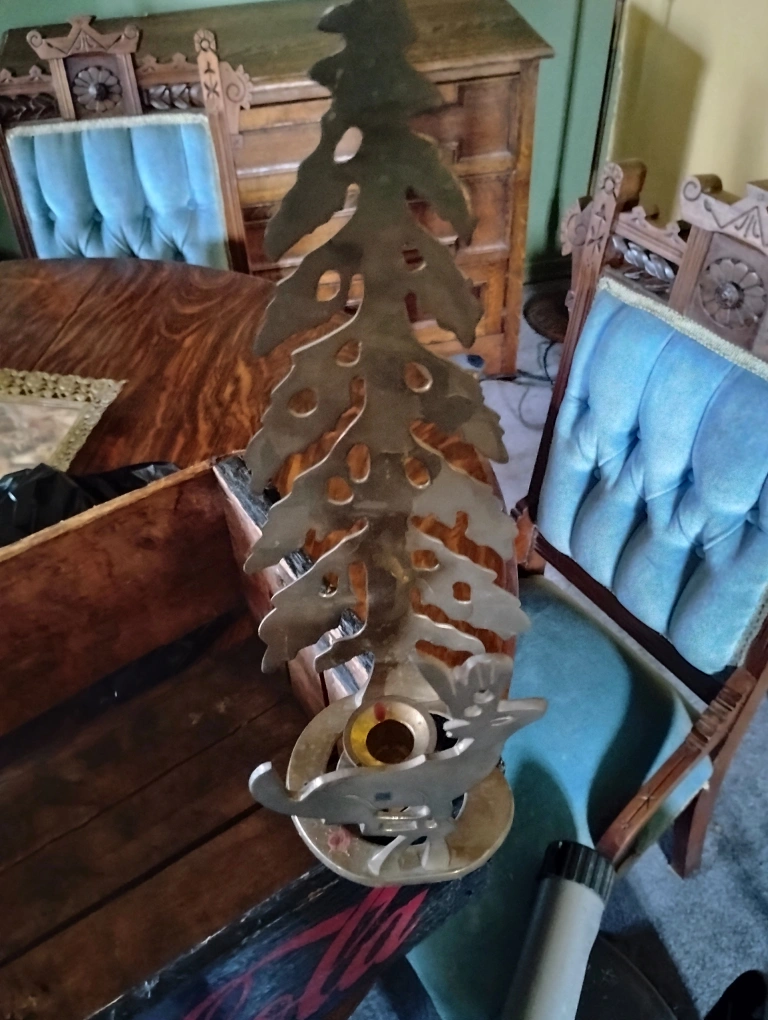 Check out this unique brass Christmas tree candle holder! It features a cute deer design at the base. Perfect for adding a touch of festive charm to your home this holiday season 14 inches tall . Solid Brass.