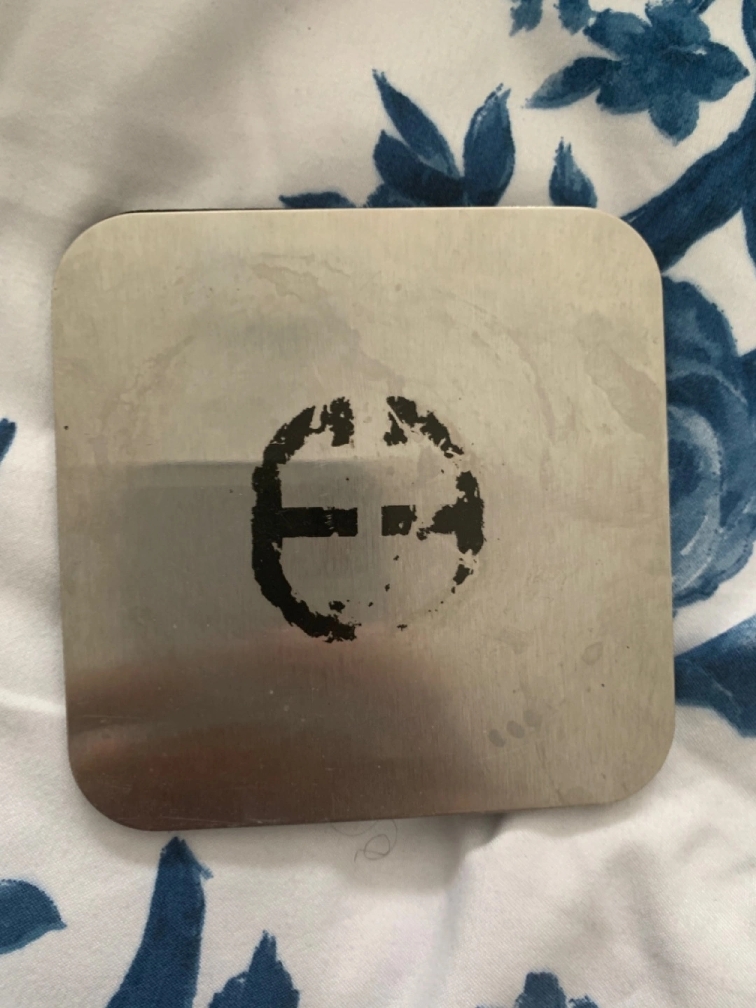 Square metal coaster. Features a circular logo. Shows some minor wear.