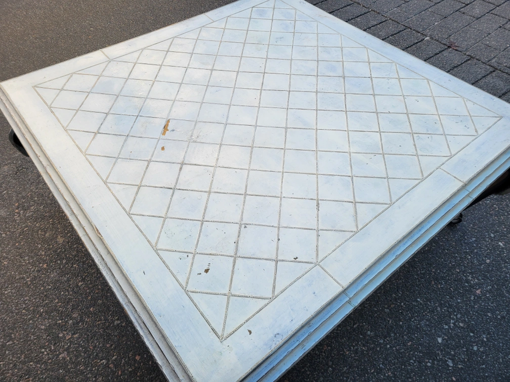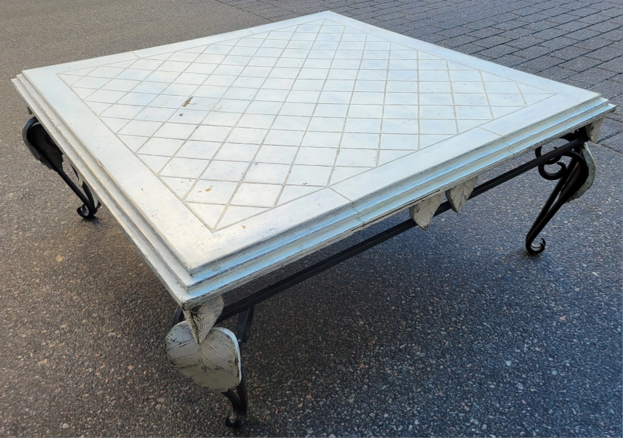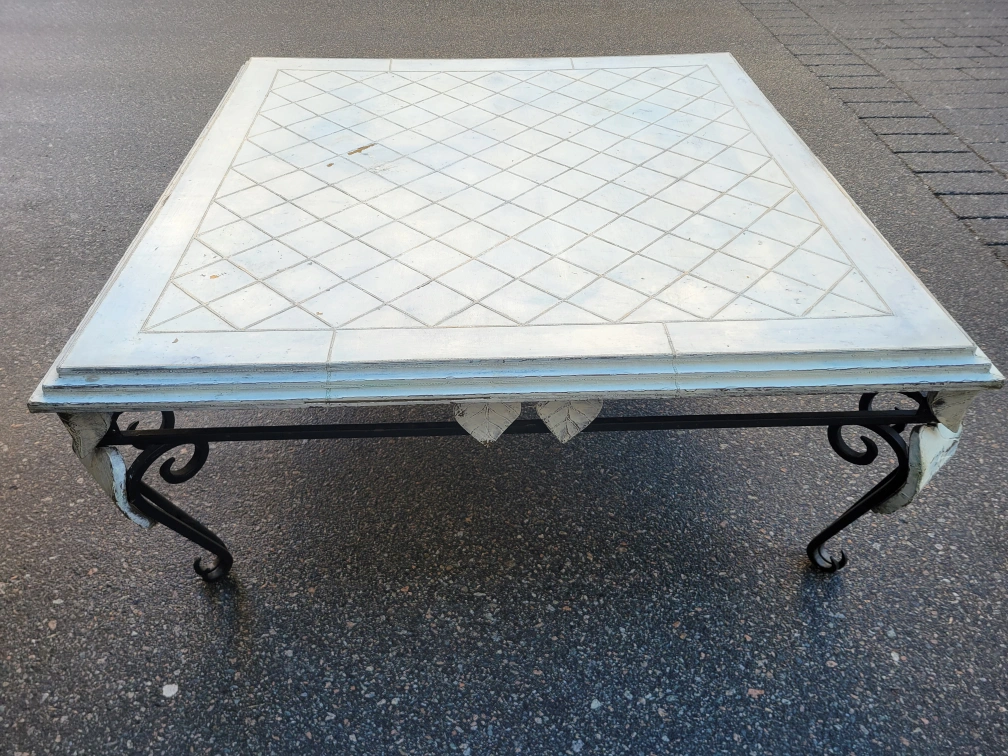 103Very unique metal coffee table. Features a large square white top with a diamond pattern and black metal legs. Measures 39" x 39" x 16". Let me know if you're interested. Delivery available if needed. Thanks for viewing.