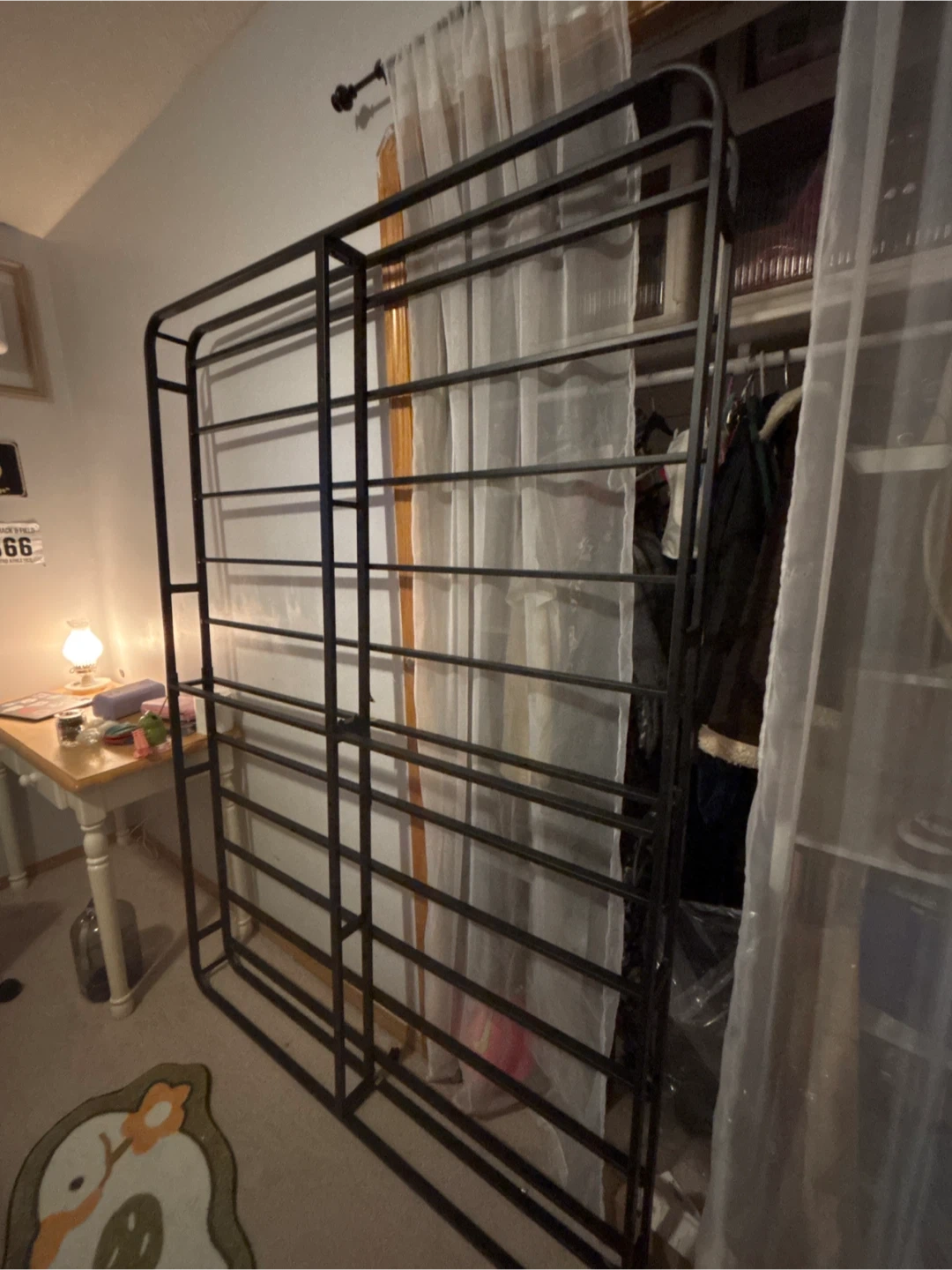 91A metal double bed box spring that’s very sturdy has no rusts. The height of the box spring while laying down is about 5 inches. Fully assembled, it’s joined with nuts and bolts that use an Allen wrench key. Cash only