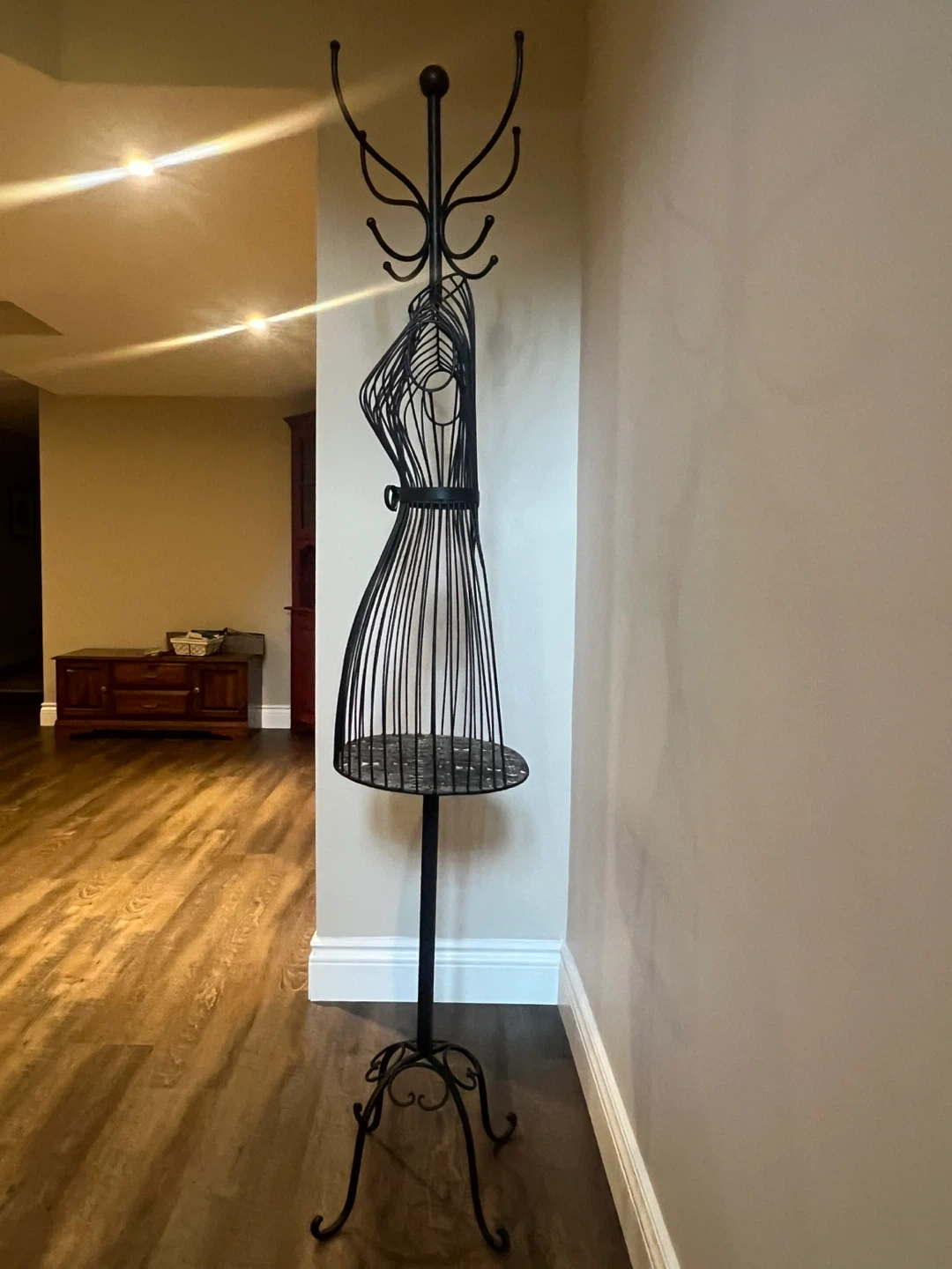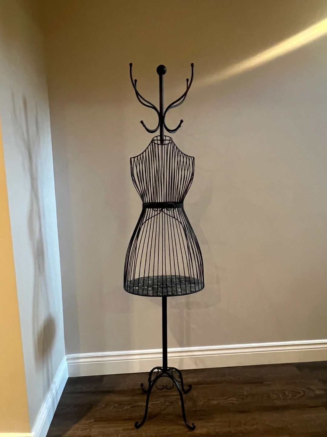 This is a unique metal dress form coat rack, perfect for adding a touch of style to your entryway or bedroom. It's in great condition and ready to hold your coats, hats, and scarves. The design is both functional and decorative, making it a great addition to any home!