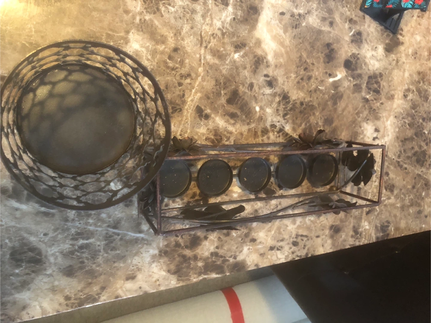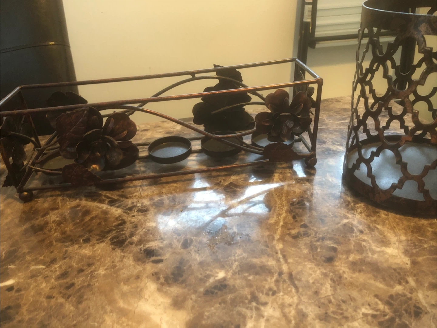 133Two metal candle holders with floral designs. One is rectangular and the other is cylindrical. They have a rustic, antique look