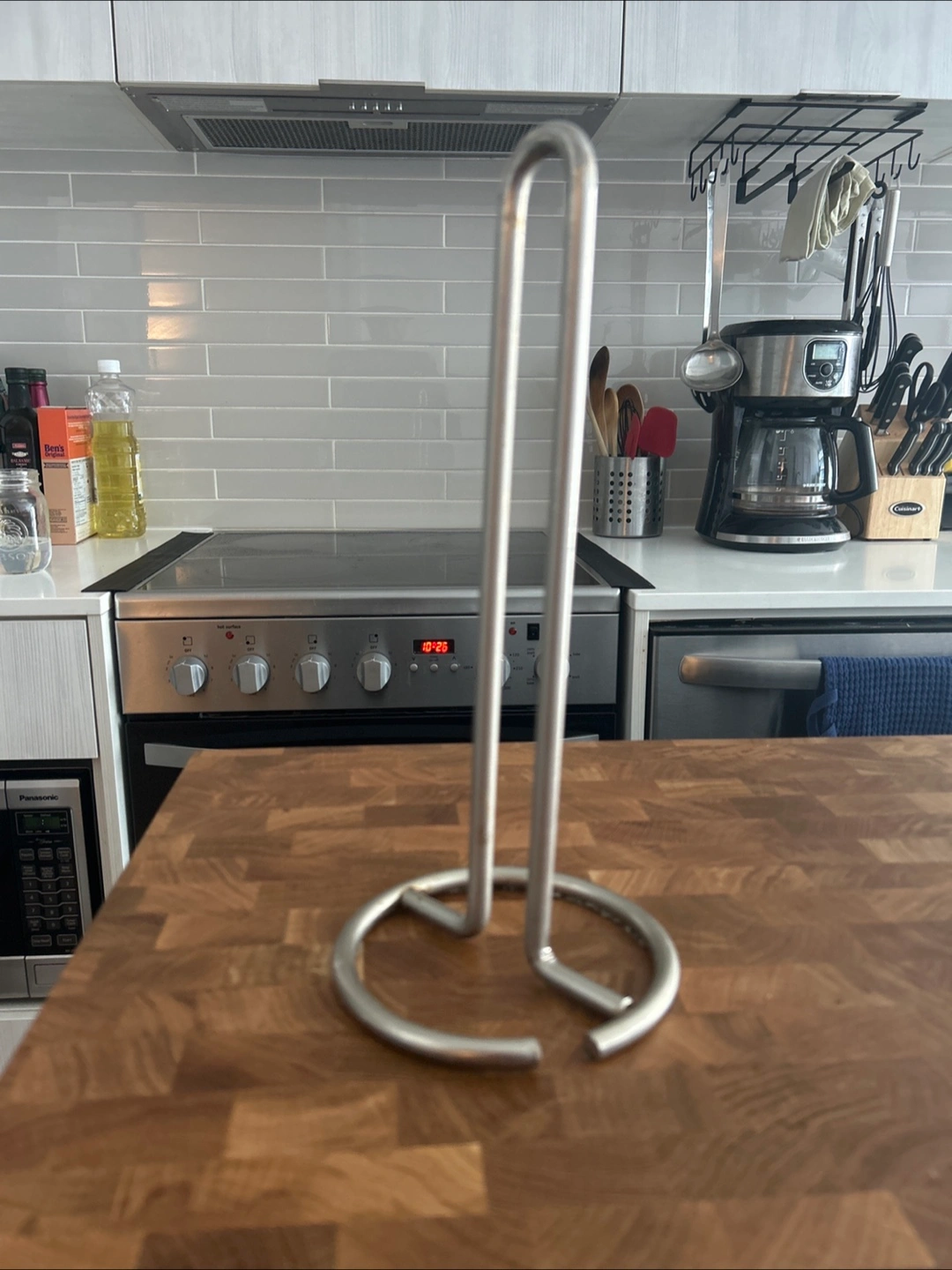 67Metal paper towel holder. Features a circular base. Offers a handle at the top for easy carrying. You can keep it on your counter to make cleaning up after dinner even easier.