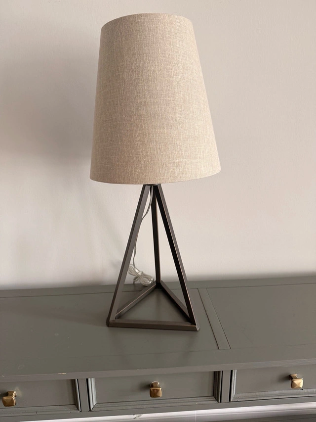 15Illuminate your space with this modern metal table lamp, standing 30.5 inches tall with a 13-inch wide shade, offering a stylish lighting solution. This used lamp is in good condition, ready to brighten up your home. Specifications: * Overall Dimensions: 30.5" H x 13" W x 13" D * Base Dimensions: 8" W x 8" D * Shade Height: 13" * Product weight: 6lbs I've priced it at the higher end due to its excellent condition. If the ad is up, the lamp is available. Don't miss out on adding this sleek piece to your decor!