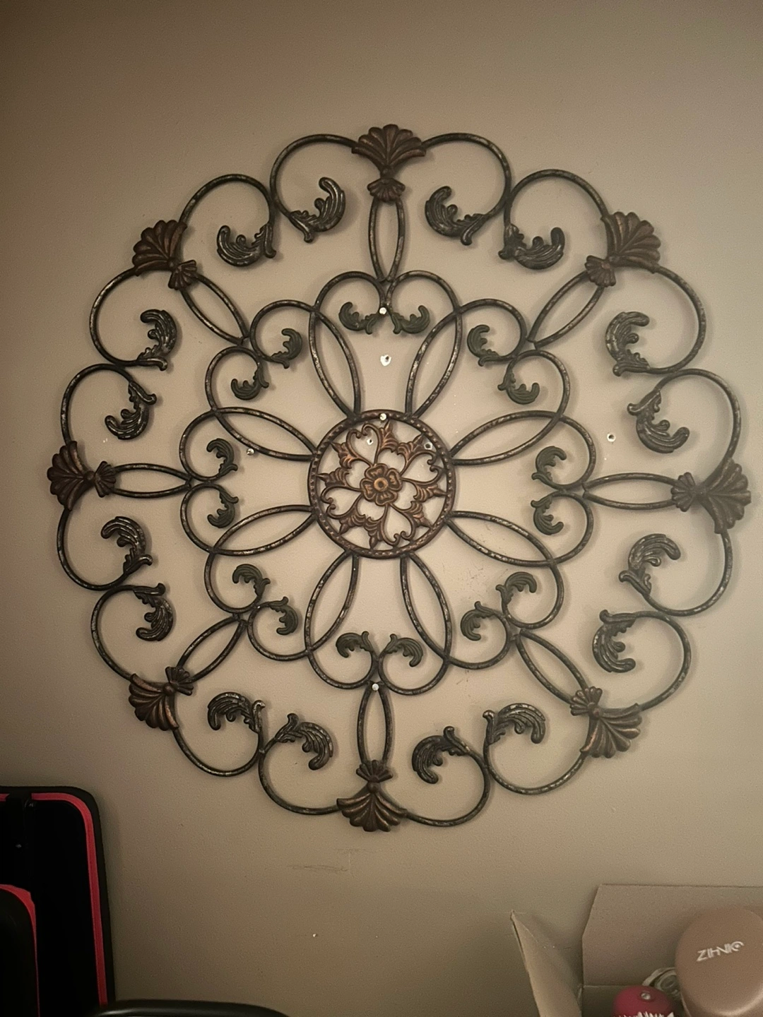 This is a lovely metal medallion wall decor piece. It adds a touch of elegance to any room. It's in great condition and ready to find a new home!