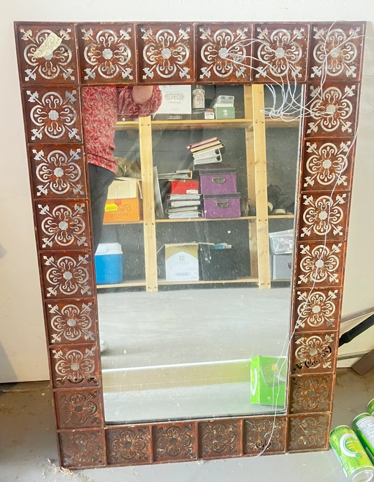 20This mirror features a unique, intricately designed metal frame. It is very heavy. 26.5” wide by 38” tall