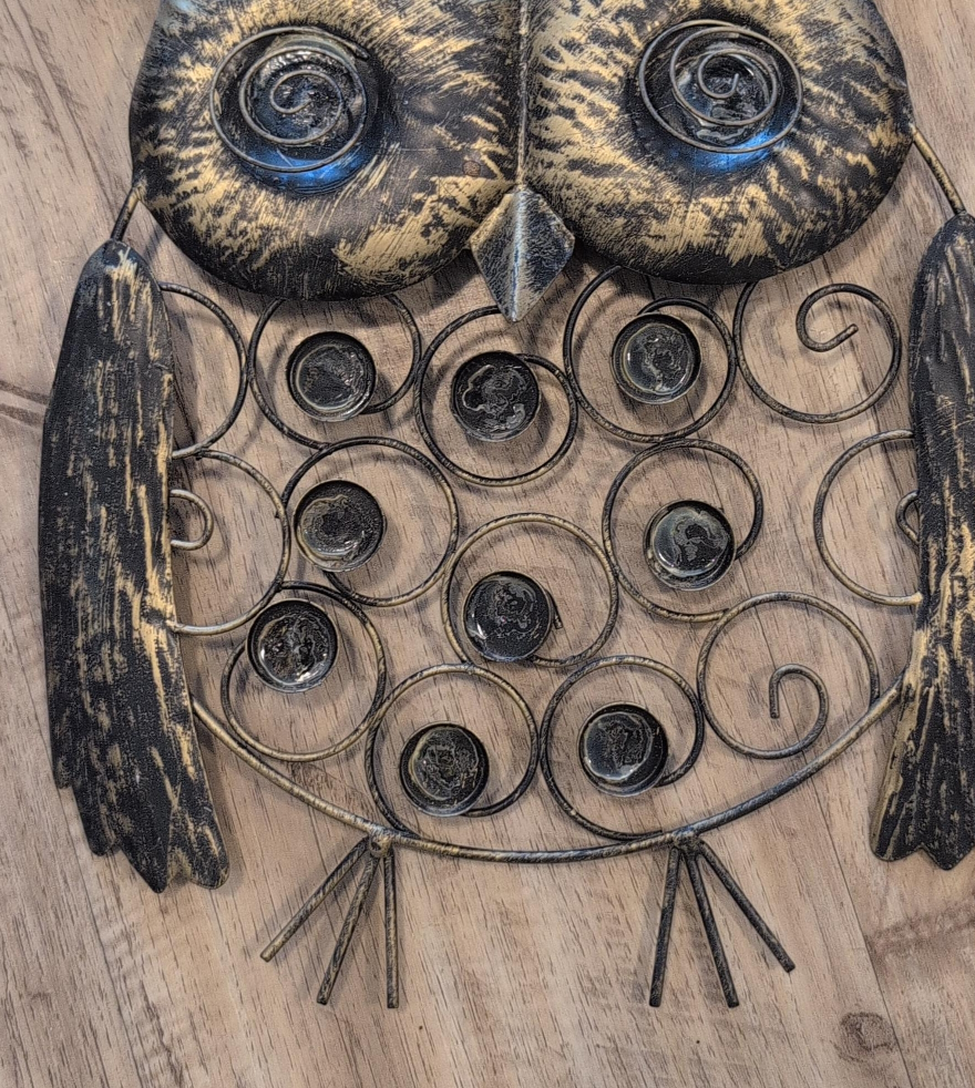 137Cute metal owl wall decor. It has a unique design with swirling metal and glass accents. Perfect for adding a touch of whimsy to any room!